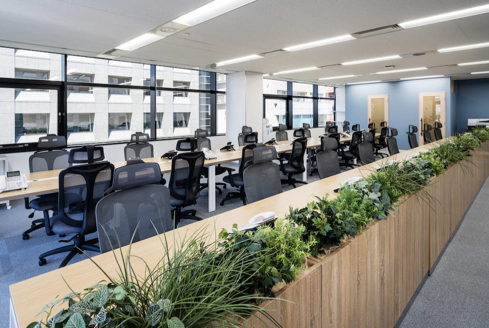 執務内は、コーポレートカラーであるブルーを基調にしたデザインとし、カジュアルで明るい印象の空間としました。増員に対応できるよう、移動が容易な家具を選定し、シーンや人数によってレイアウトを自由に変更できるようにしています。