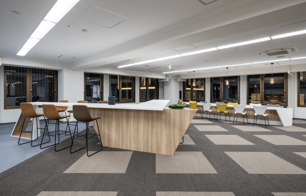 バーカウンターを中心に配置し、打合せテーブルやハイカウンターを周りに散りばめることで、バーカウンターを起点に様々なコミュニケーションが生まれるようにしました。