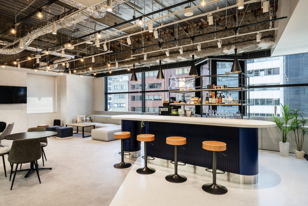 エントランスからもアイキャッチとなり、アクセスしやすい位置に配置したバーカウンター。夜になると社員の方々が集まり、夜景を眺めながらお酒を飲むことができます。