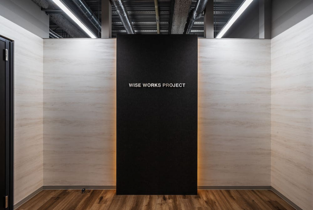 移転前とは一変したカラーリングで、スタイリッシュなエントランスデザインに。移転をきっかけに、ワイズワークスプロジェクト様の更なる成長と飛躍を来訪者にお伝えできる空間に仕上げました。