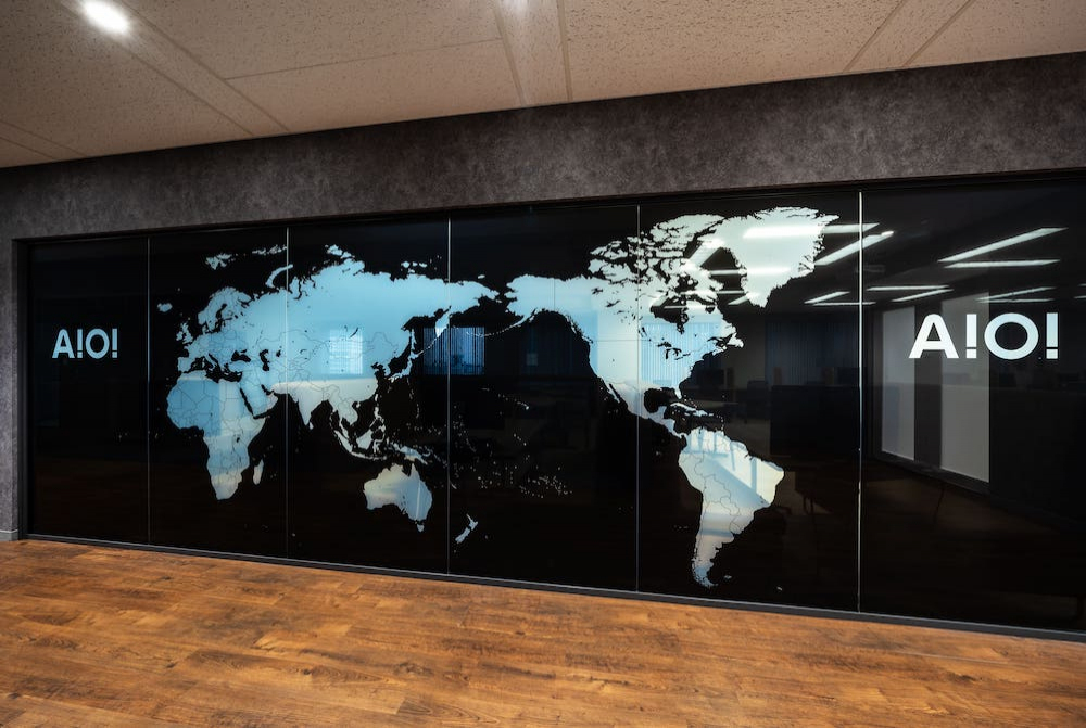自動ドアの先はMTG ROOMが連なる通路へと続きます。こちらはエントランスとは対照的にシックで落ち着いた空間にしています。ワークスペースが透けて見えるガラス面には世界地図のグラフィックを取り入れ、世界中の国々の製造・物流現場に進出し多くの仲間と共に事業を行うAIOIにふさわしいデザインにしました。