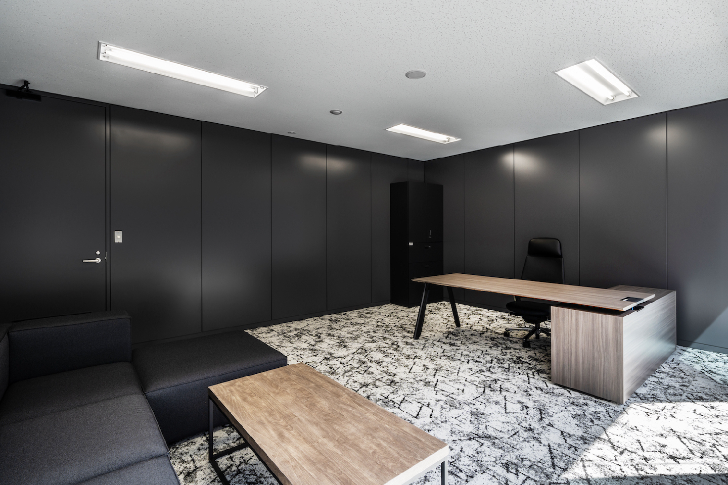 シックなカラーでまとめたEMS様らしい開放的な空間。