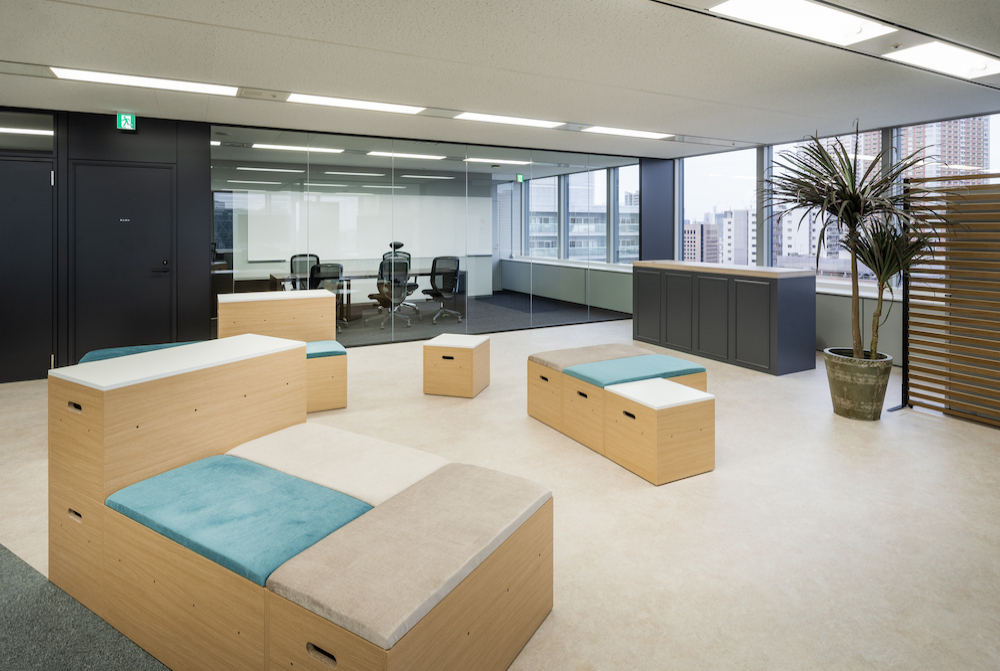 オープンエリアには、フレキシブルにレイアウトを変更できる組木スツールを採用し、リフレッシュスペースやセミナー、イベントにも対応できる環境を整えました。