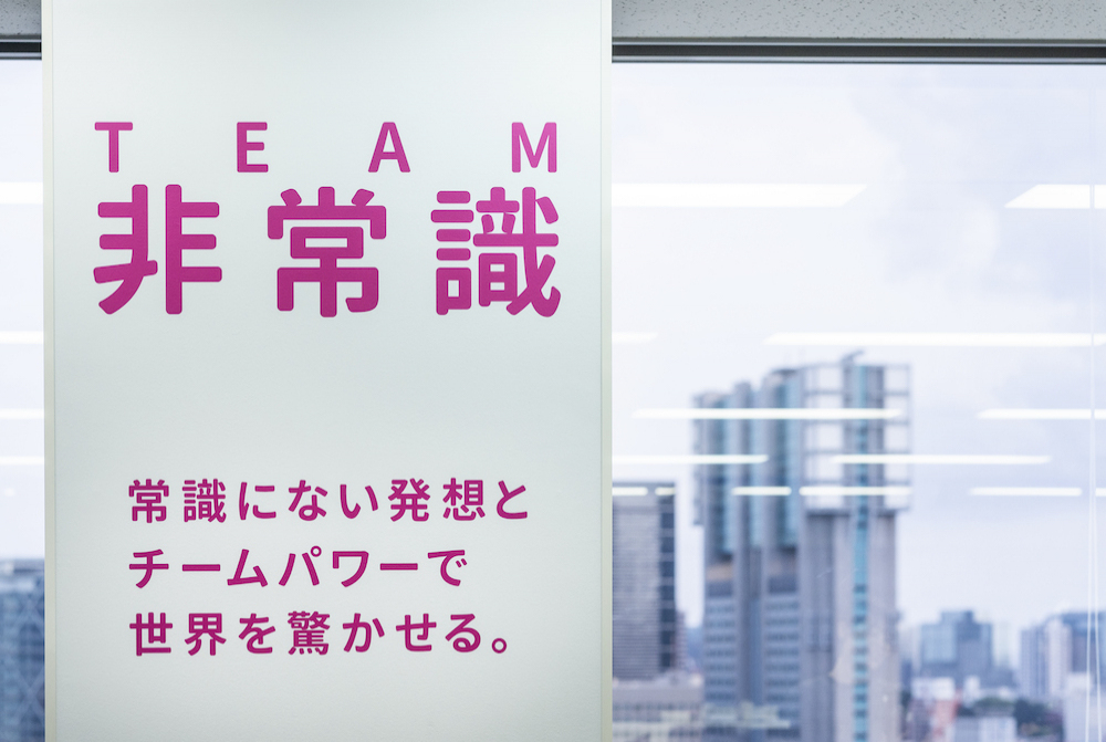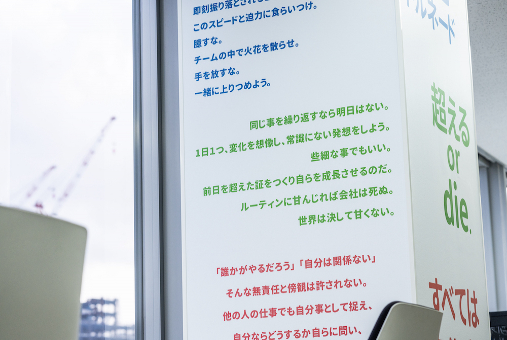 テクダイヤ様の企業ステートメントに掲げられた行動指針を可視化し、オフィスエリアのどこにいても目に入る位置に大きくデザインしました。これにより社員の意識が高まり、会社の理念の浸透につながります。