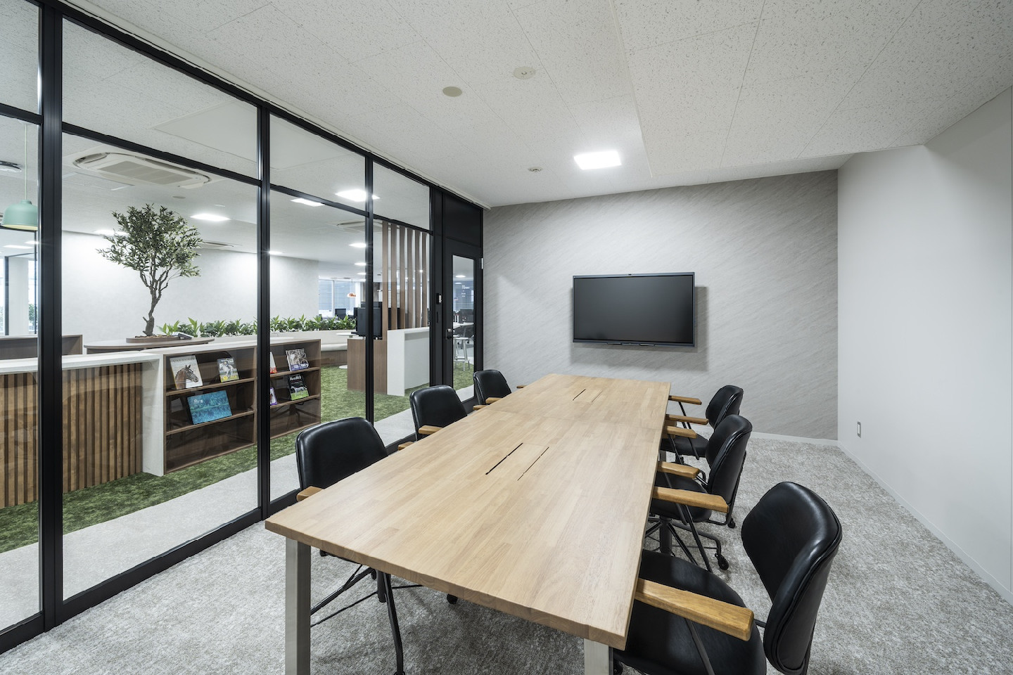 一方で、執務エリアはシンプルなオフィス家具と木目調のデスクを用いることで、共用スペースと区別しながらも全体の調和を保つ工夫をしています。また、それぞれのエリアで間仕切りがあるもののガラスを用いて抜け感を重視し、開放感を担保しています。