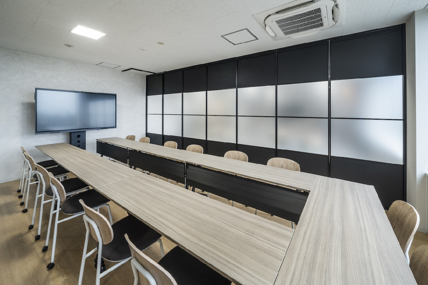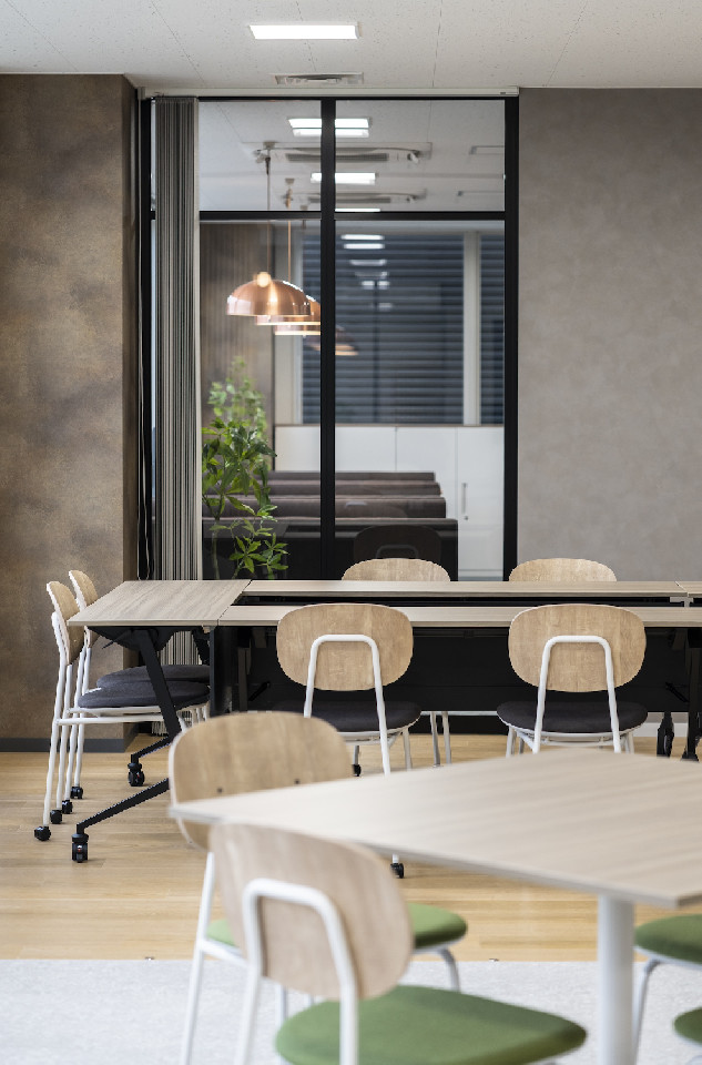 窓に面して、イベントやセミナーに対応できる広々としたスペースを設けています。可動式パーテーションを活用することで、奥のエリアを会議室として柔軟に利用することも可能です。