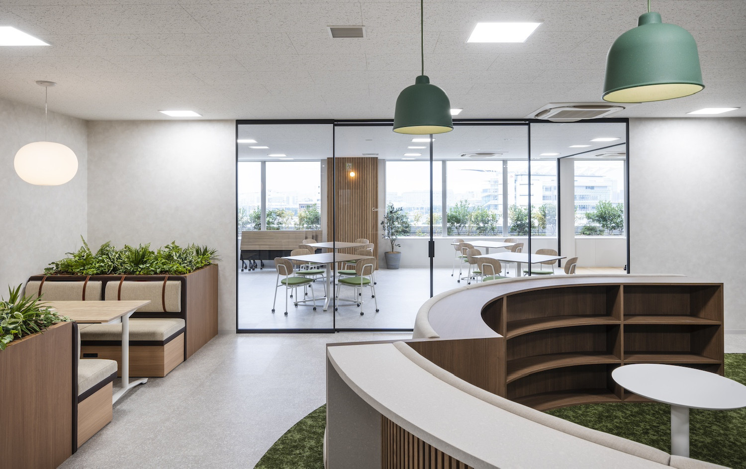 大きなテーブル席のほかにも、窓側にソファ掛けのボックス席を設け、多様な働き方に対応。ペンダントライトを設置し、明るい自然光が感じられるカフェのような空間になっています。