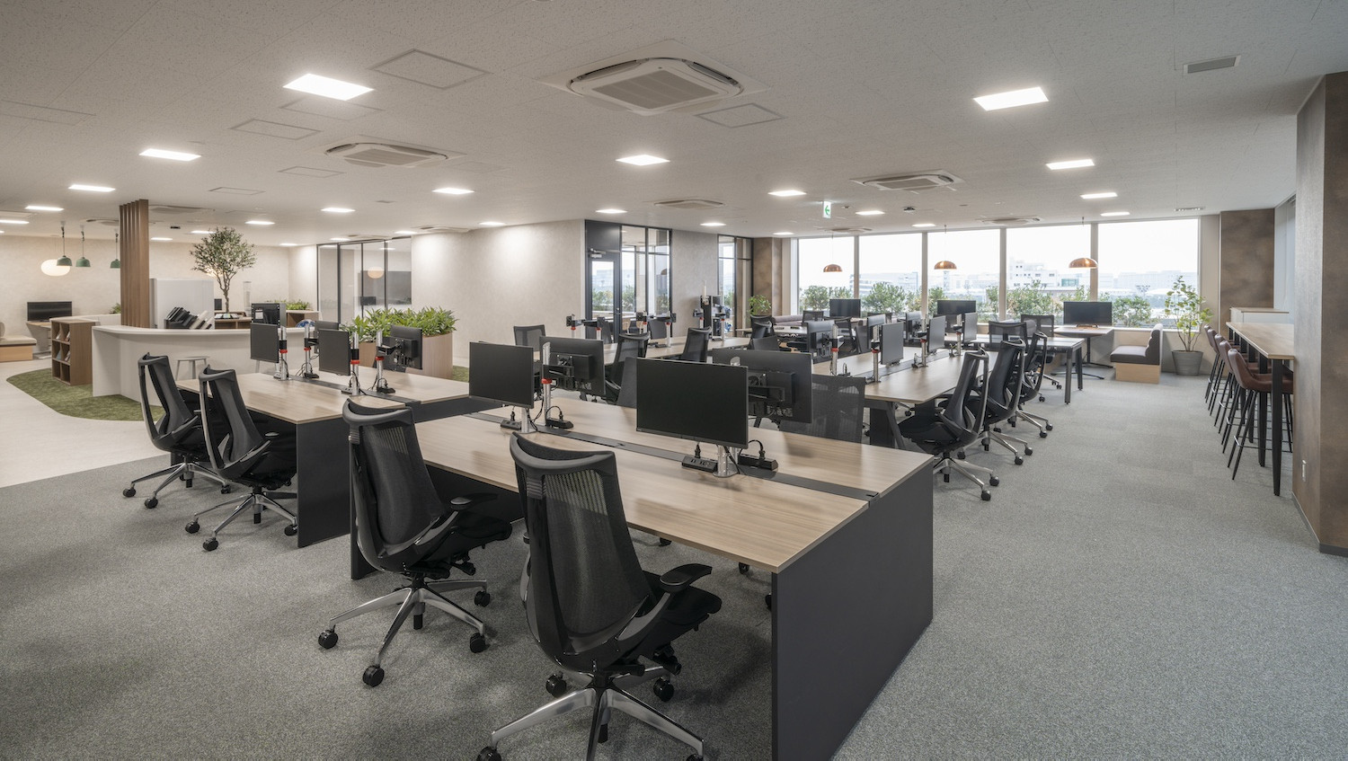 執務エリアは木目調のすっきりとした大きなテーブル席を中心にしたフリーアドレスで構成。アーム式モニターが多く設置され、ノートパソコンを接続して快適に作業可能です。大きな窓により、見通しの良い開放的な空間が広がっています。
