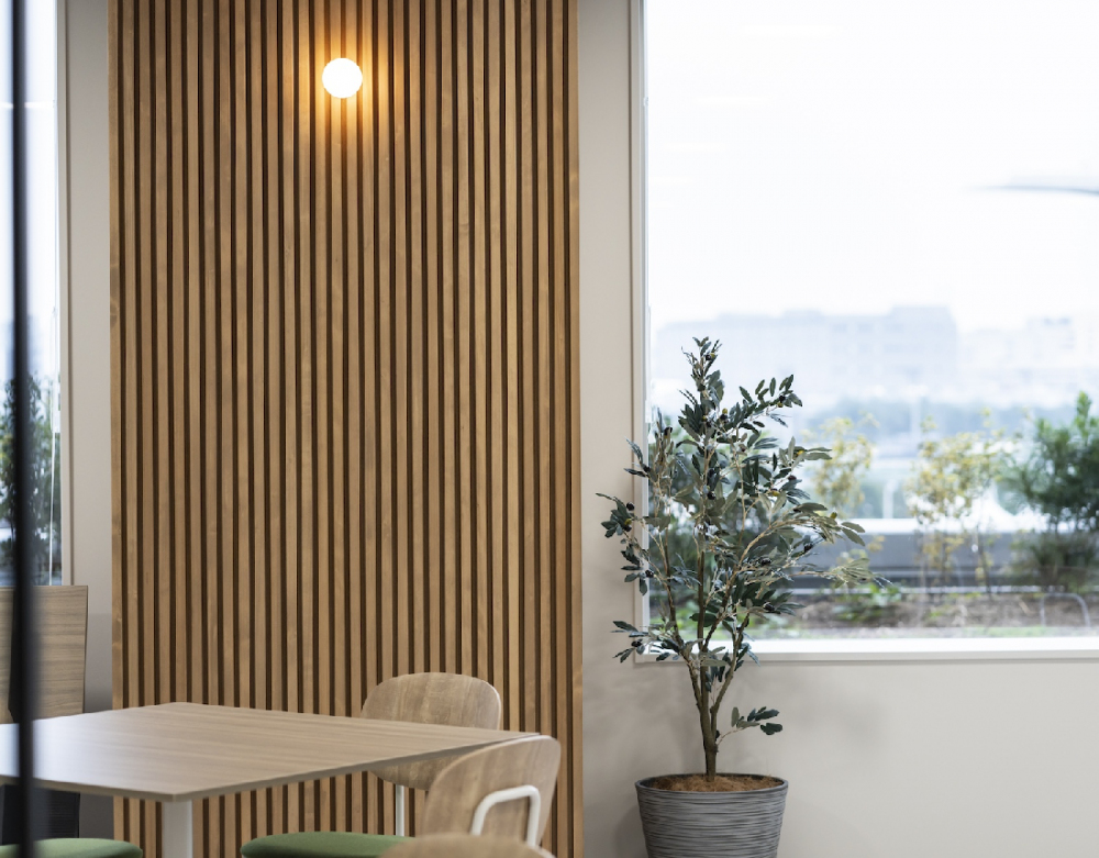 窓の外にはビルのバルコニーの植栽が見え、室内から見通した景観がさわやかな印象を与えています。