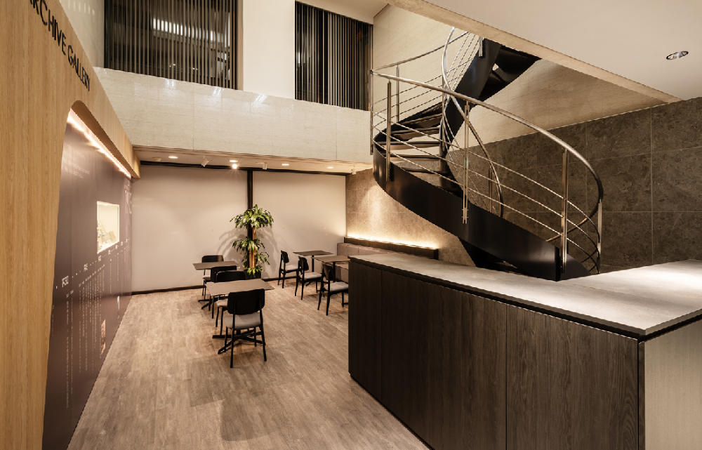 1階は吹き抜けを活かし、来客用スペースとしてリノベーション。ヒストリーパネルをディスプレイしてギャラリーのような空間を創出しました。