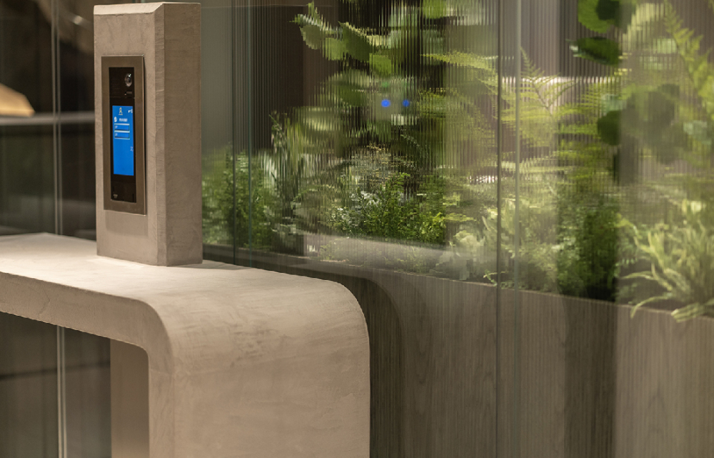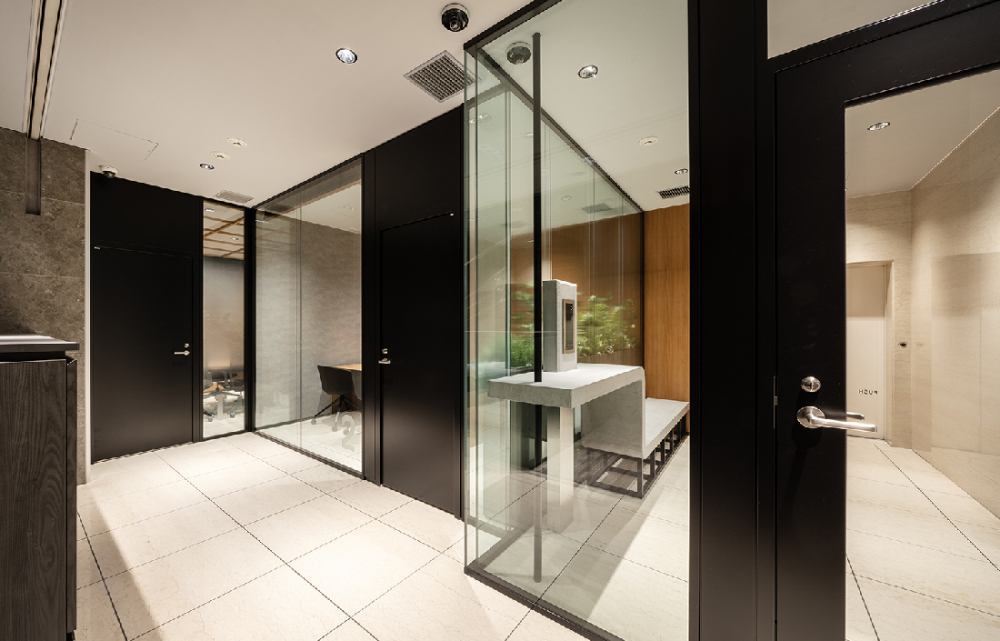 エントランスにはセキュリティシステムを導入。ガラス壁で仕切り、抜け感を持たせています。