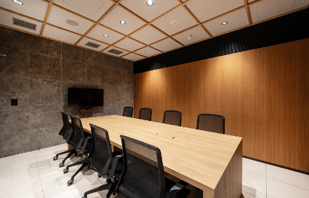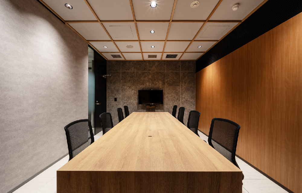 既存の床や天井に木目や石目を組み合わせ、モダンな雰囲気を演出した小会議室。既存天井には木製の格子を組み合わせ、効果的に意匠を加えています。
