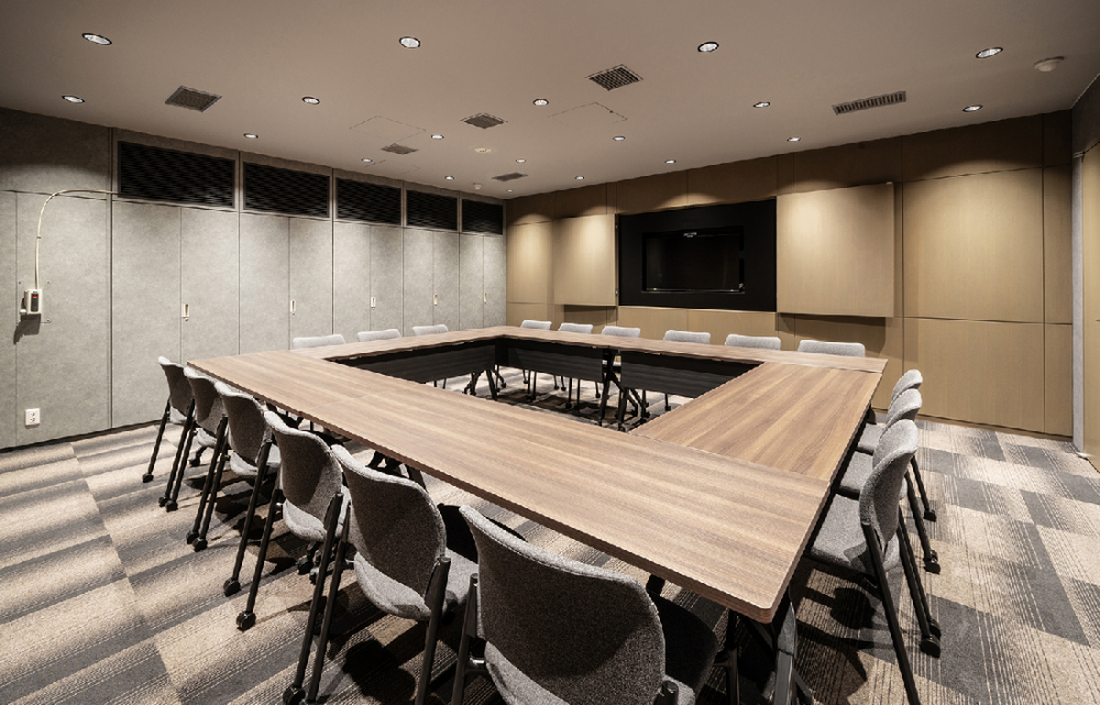 大会議室は、木目の壁を採用し、すっきりとした印象に。ダウンライトで雰囲気のある調光を実現しました。また、グレートーンのタイルカーペットで落ち着きのある空間に仕上げました。
