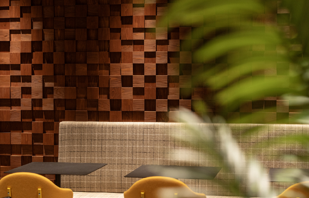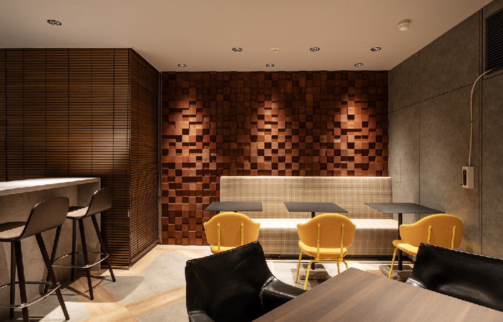 壁面にはモザイクウッドのウォールパネルを使用し、椅子は多様なタイプを組み合わせて空間にアクセントを加えました。