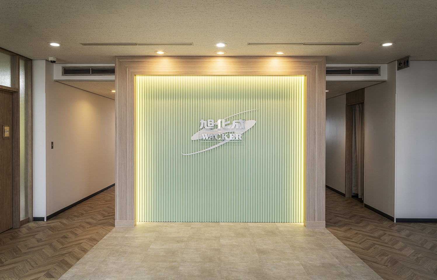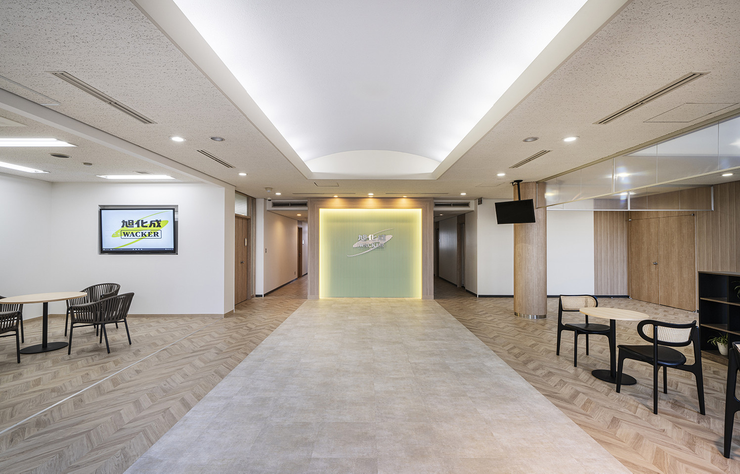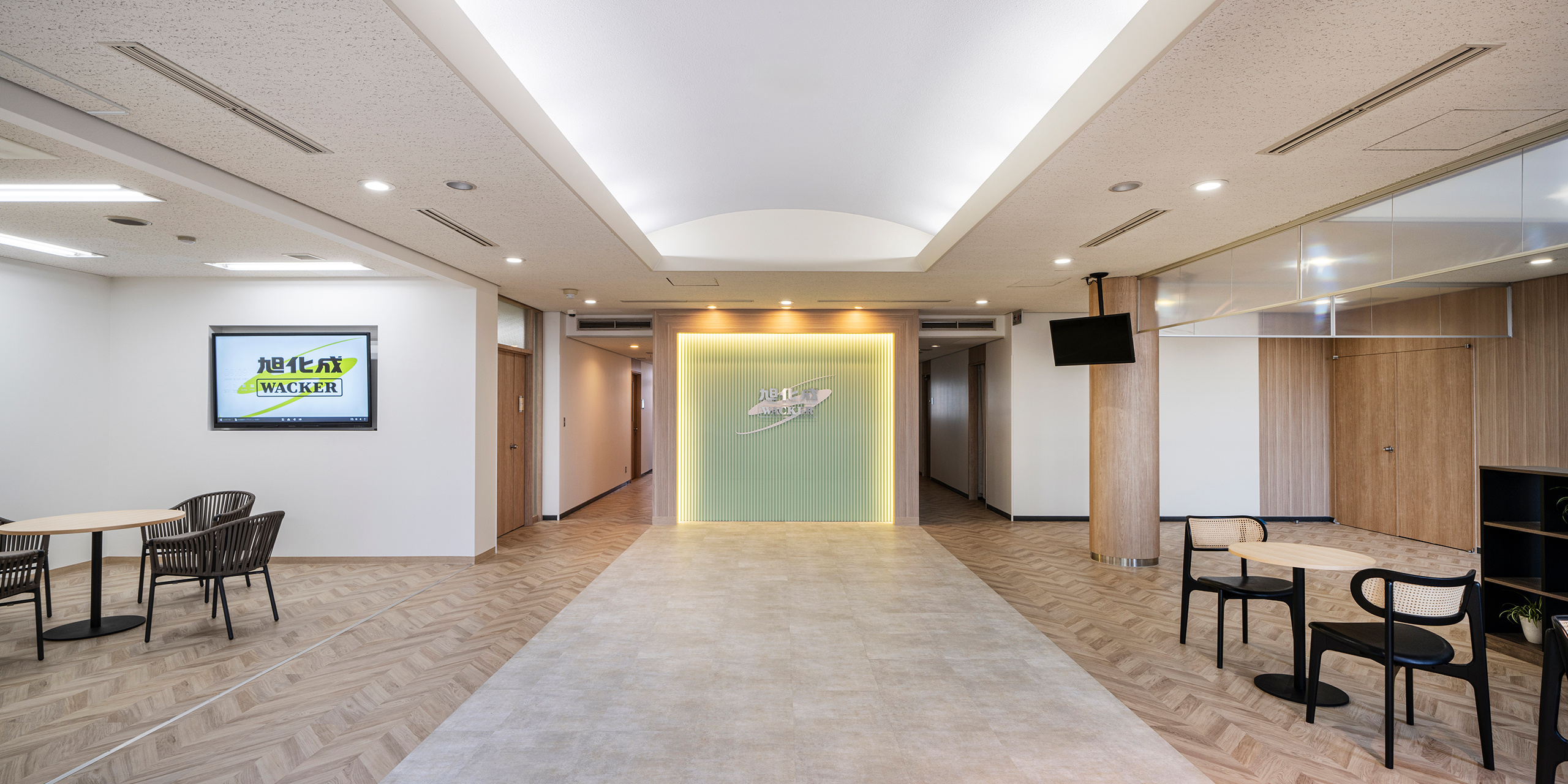 エントランスと執務室は温かみのある木目素材を取り入れつつ、シンプルで心地よいデザインを採用しました。明るく開放感のあるエントランスには、コーポレートカラーをアレンジしたリブ材にカンパニーロゴを配置し、社員の皆様や来訪者様にとって印象的な場となることを目指しています。