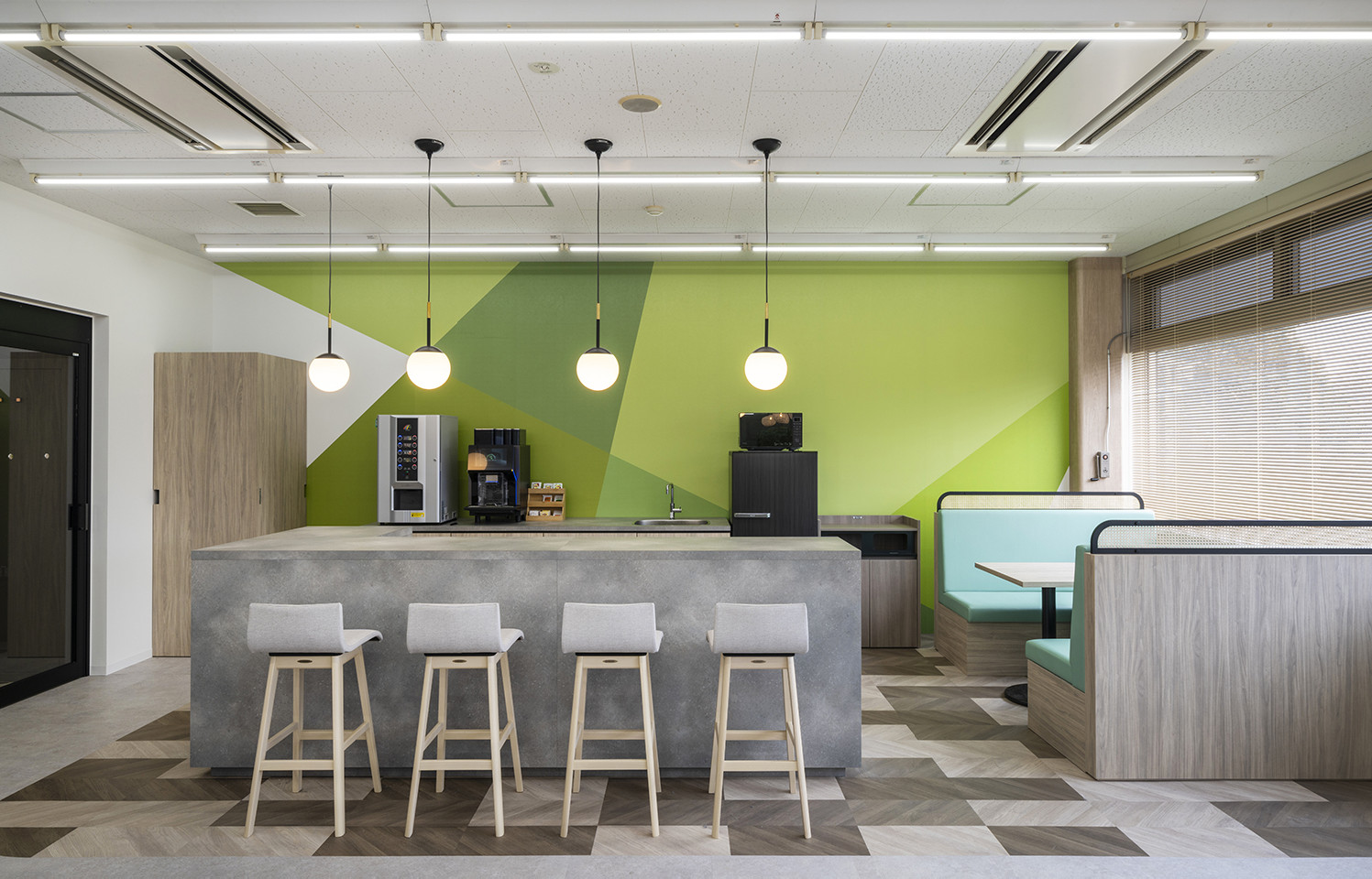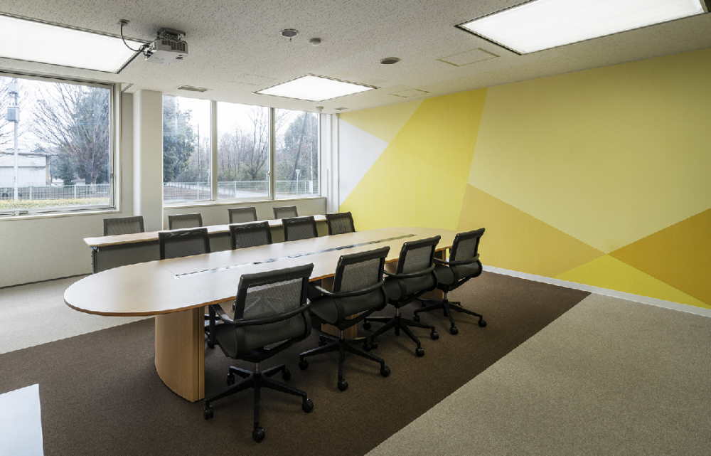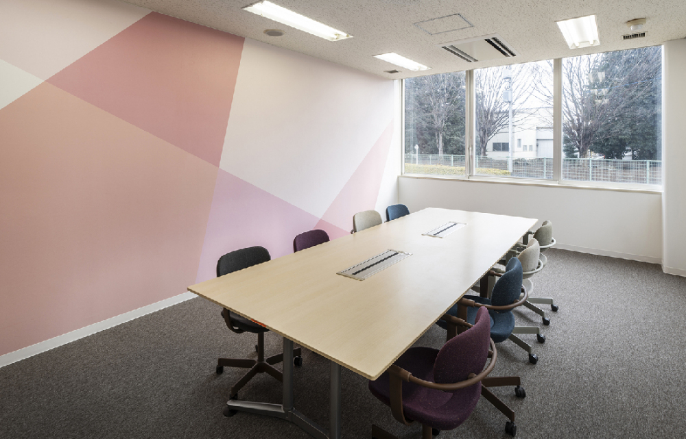 会議室ごとに、幾何学パターンのグラッフィック壁面を拝し、コミュニケーションを促進する効果を狙っています。