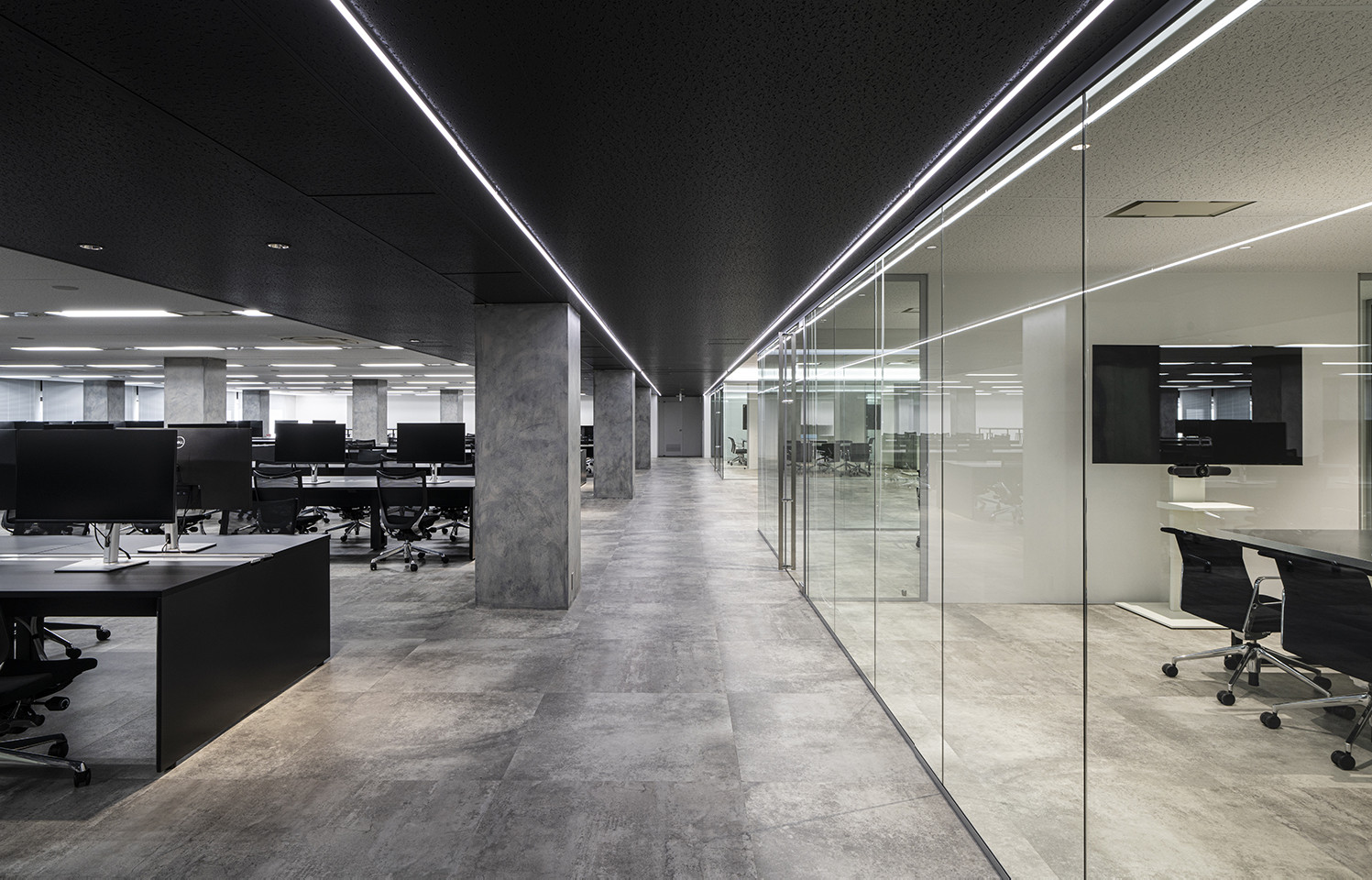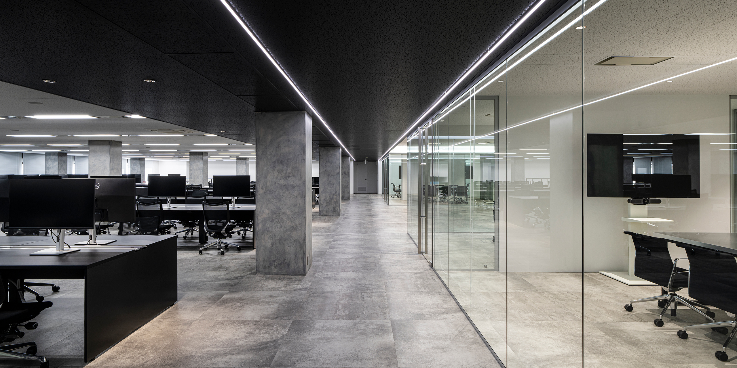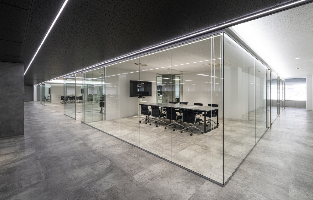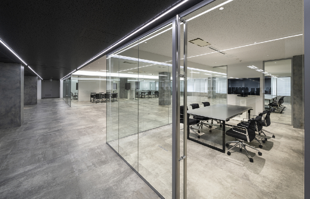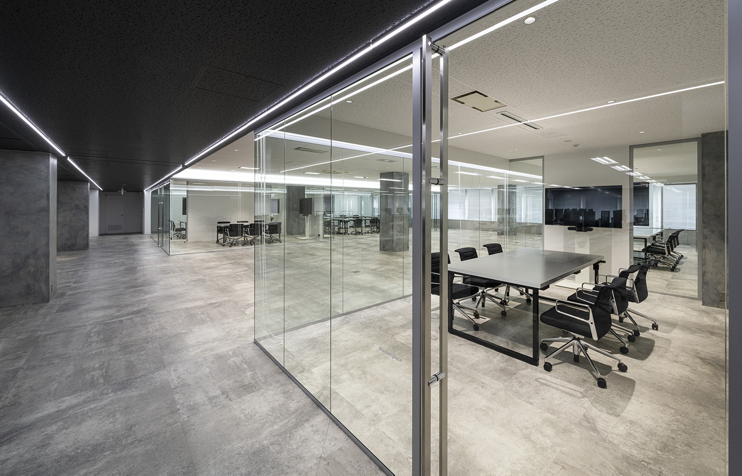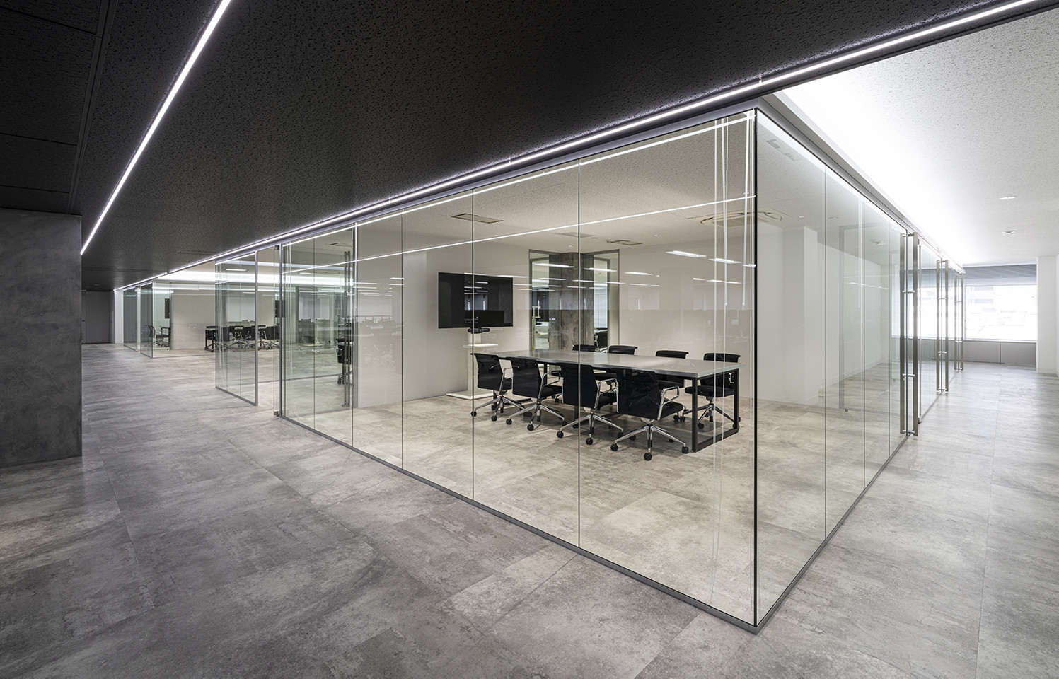 事業の成長とカンパニーバリューの向上を目的にオフィスをリニューアル。執務エリア、ミーティングスペース、来客スペースを主にガラス張りで仕切り、そこで働く人々や活気を見せる「ショーケース」のような空間に仕上げました。強化ガラスとライン照明を組み合わせ、オフィス全体が見渡せる開放感を実現し、シャープなデザインに仕上げています。