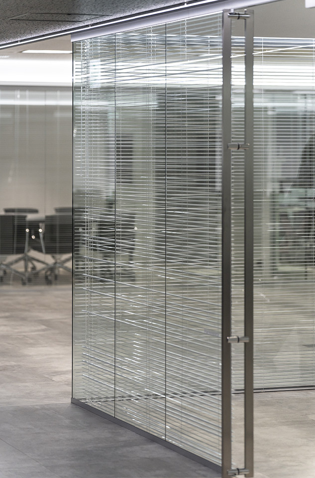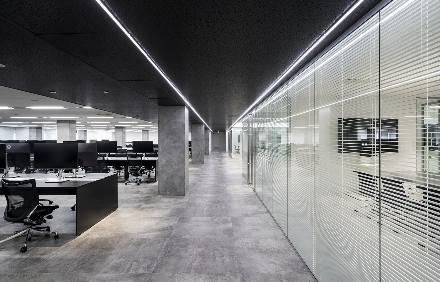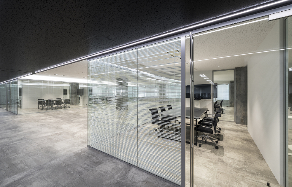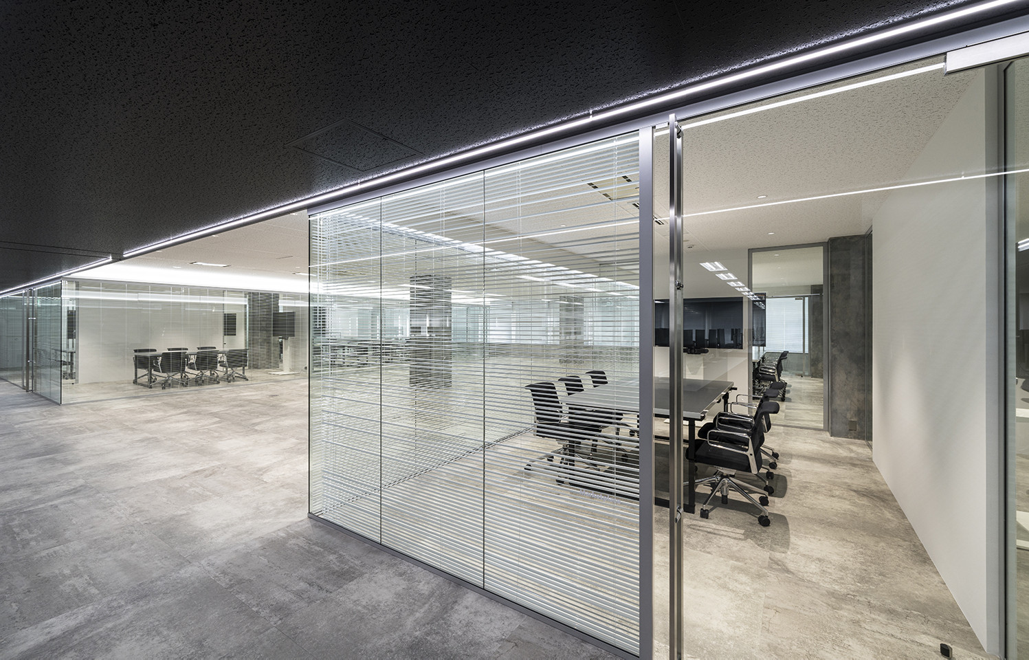 ライン照明とガラス壁面の効果により、ブラインドを使用しても閉塞感を抑えつつ、すっきりとした印象を保っています。
