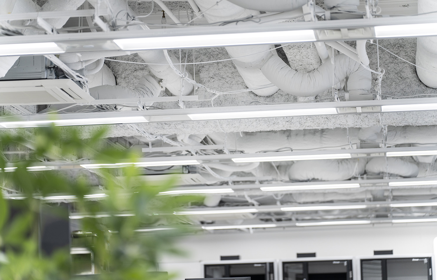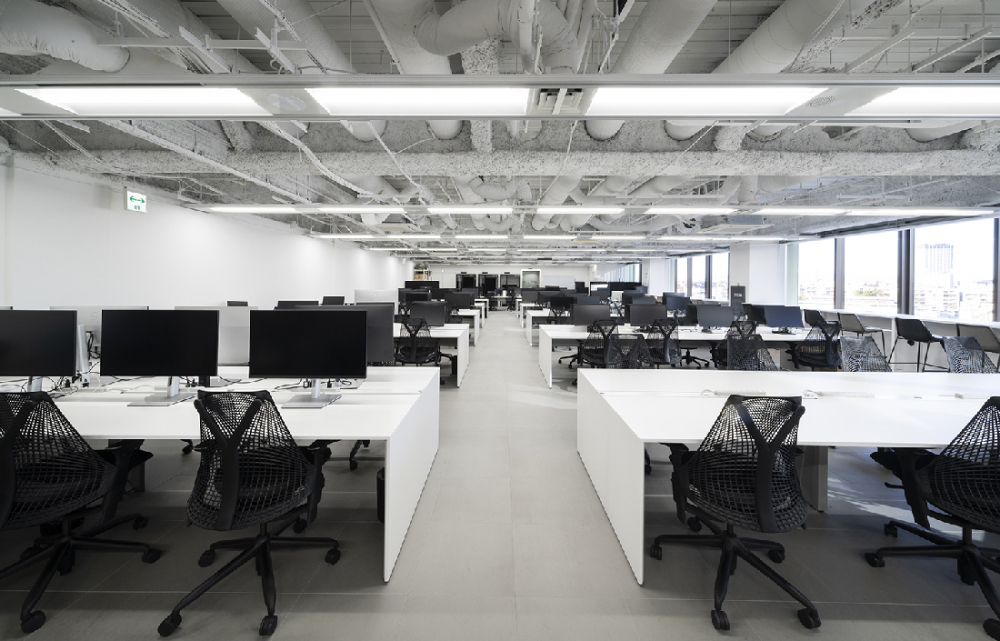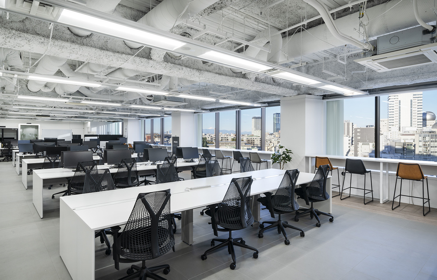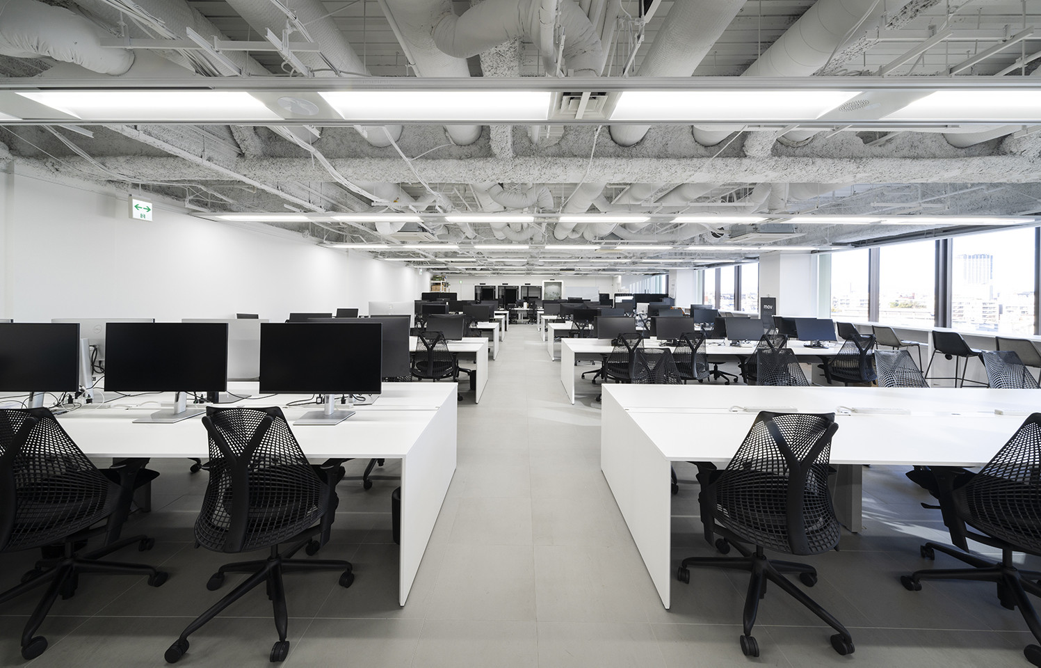 執務エリアはスケルトン天井に。白く塗装された仕上げは、スタッフのクリエイティビティを刺激します。