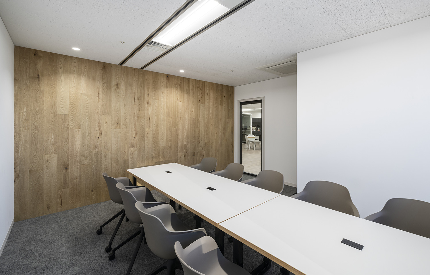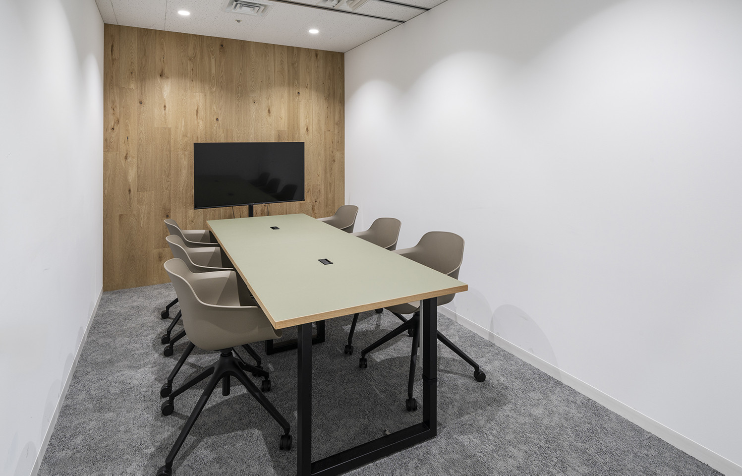 個室タイプのミーティングルーム。壁材はクロスではなく突板を使用し、素材が感じられる仕上げになっています。