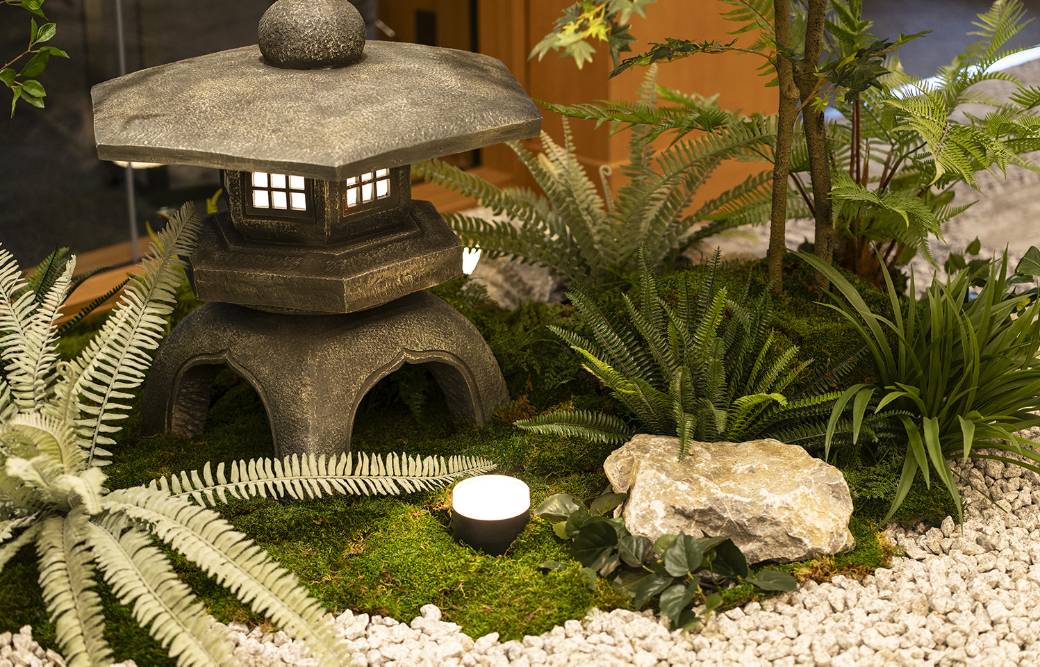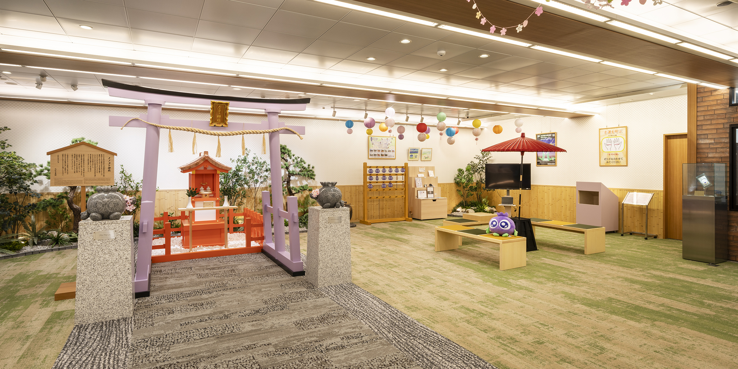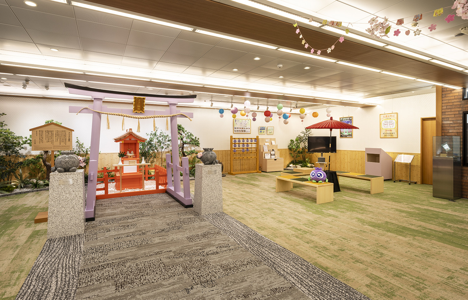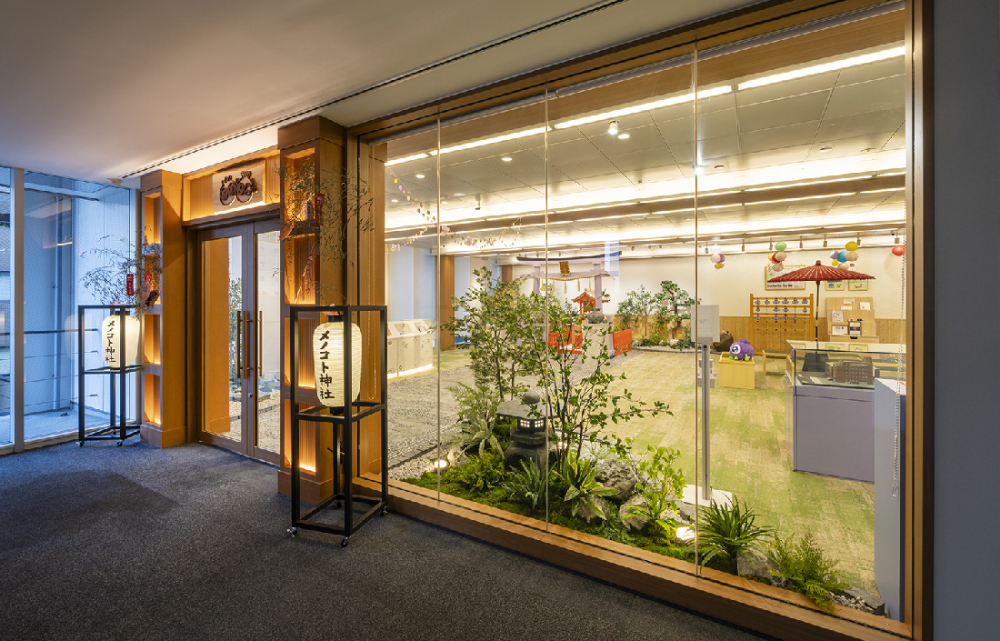 本社ビル内に設けられた「メノコト神社」は、京都の由緒ある神社の祈祷を受けて創建され、社には無病息災を願うお札が祀られています。鳥居や石灯籠、オリジナルキャラクターの狛犬に至るまで、神社を手がける職人による本格的な造作で“本物”へのこだわりを随所に込めました。紫色の鳥居を中心に据えた神社空間は、石畳や苔を模したタイルカーペットを使用し、自然の要素を取り入れています。植栽や柔らかな光に包まれることで、室内であることを忘れ、まるで屋外にいるかのような広がりと心地よさを感じさせます。企業の理念や想いが息づく、心安らぐ空間へと演出しています。