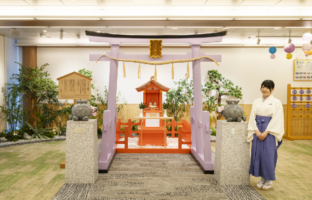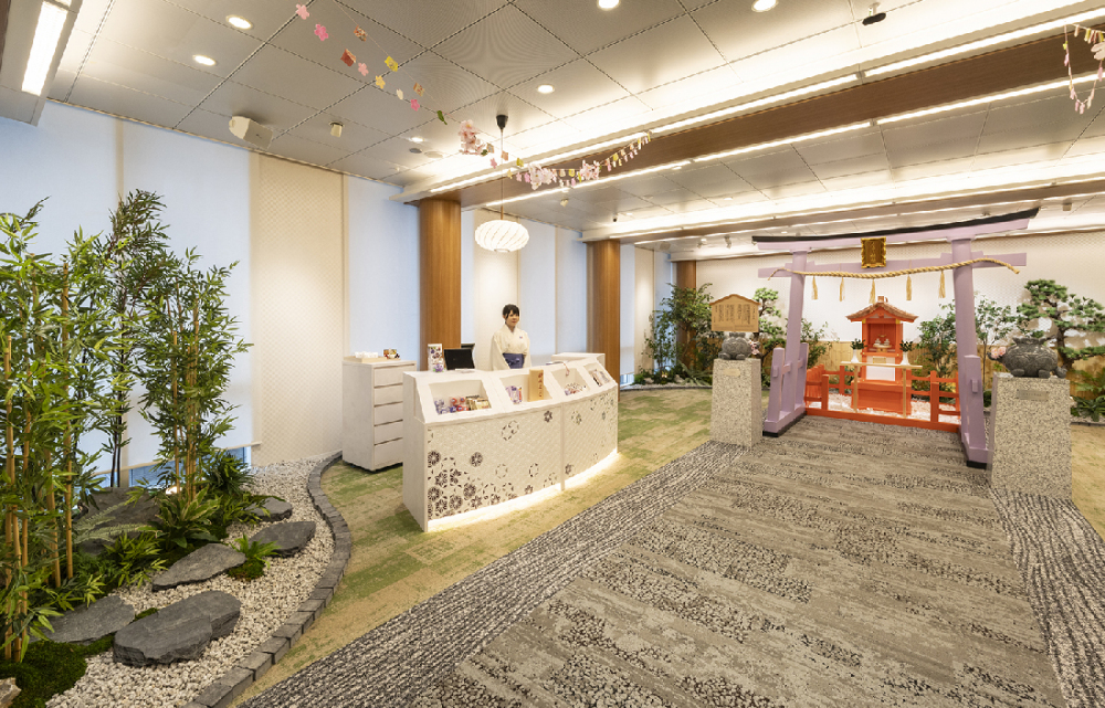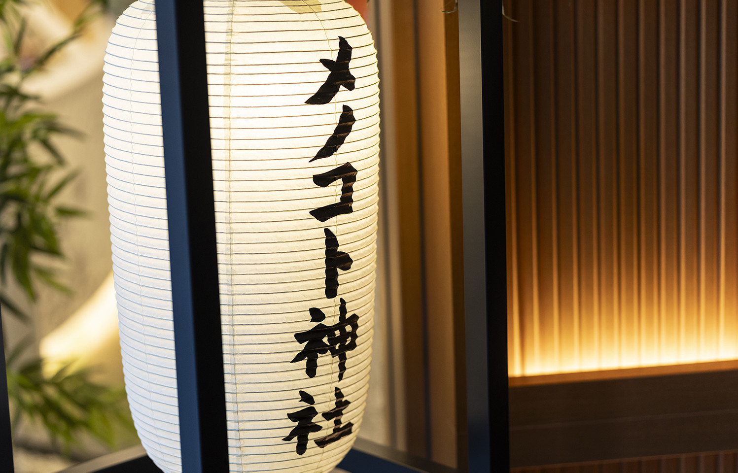 神社空間のエントランスは、木製の造作と提灯を設置し、神聖な雰囲気を醸し出しています。