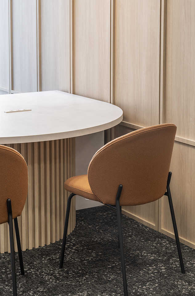 丸みのある柔らかなフォルムの低めのラウンジチェアを配置し、ゆったりとリラックスした会議空間としています。