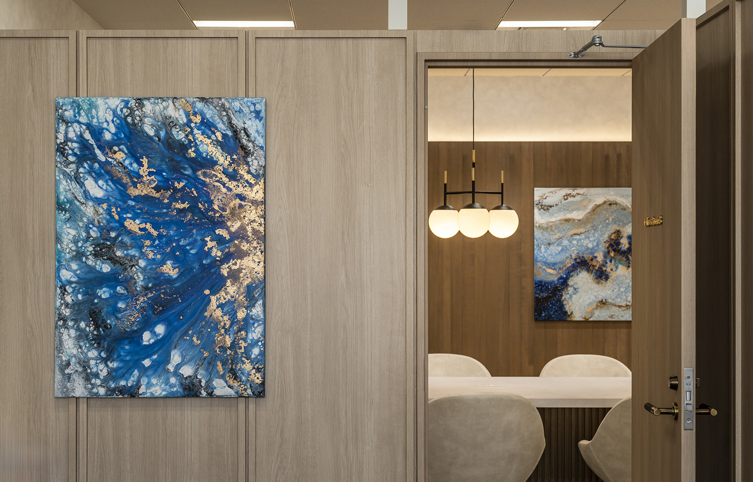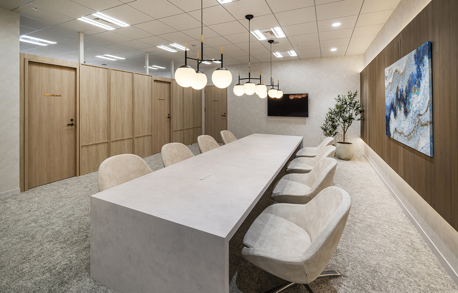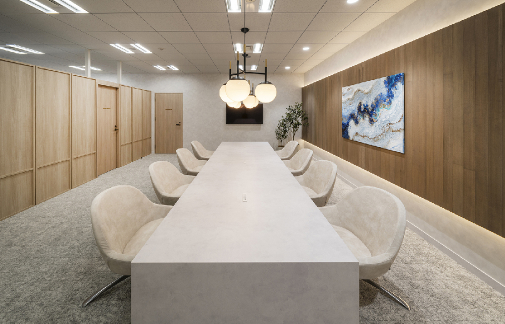 これまでローパーテーションで細かく区切られていた空間を一新し、上質で落ち着きを兼ね備えた会議室を設計しました。ナチュラルな素材感を大切にしつつも、贅沢さが漂うゆったりとした仕上がりを追求しています。大きなテーブルと柔らかなフォルムのチェアを組み合わせ、目線を低く設定することで、自然とリラックスした対話が生まれる構成に。さらに、空間のアクセントとして厳選したアートをディスプレイし、さりげない高級感を演出しています。