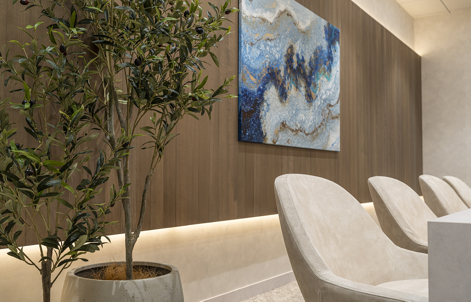 生命をテーマにした個性的なイメージは空間のアクセントであると同時に、ラウンジのようなリラックスした雰囲気を演出しています。