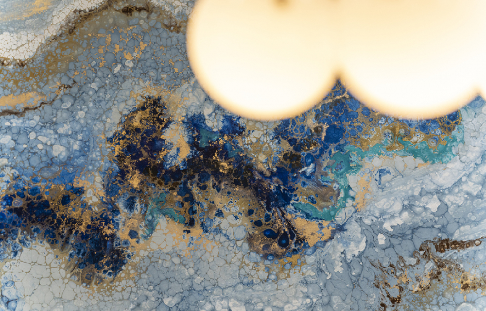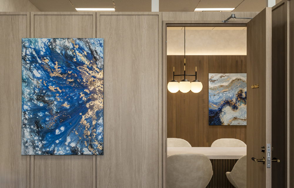 コーポレートカラーであるブルーを基調にしたアートをディスプレイ。