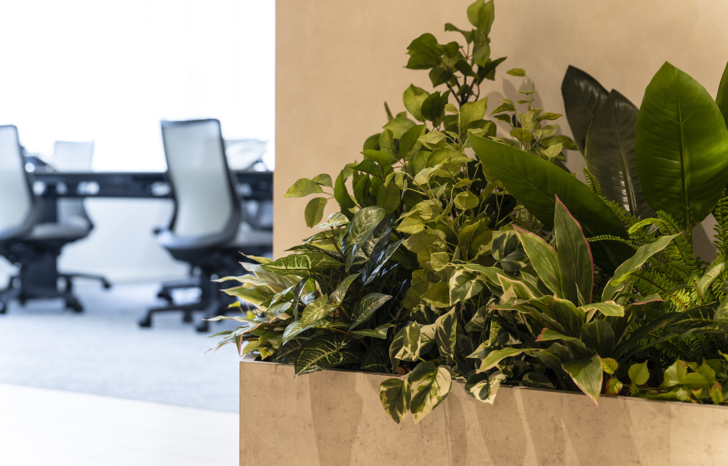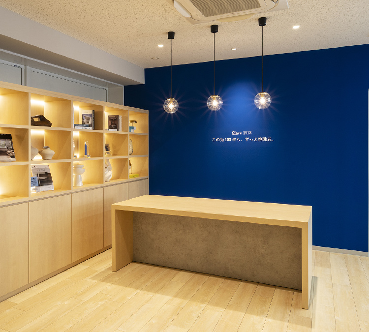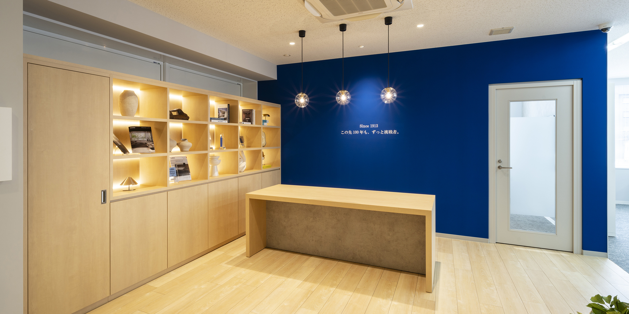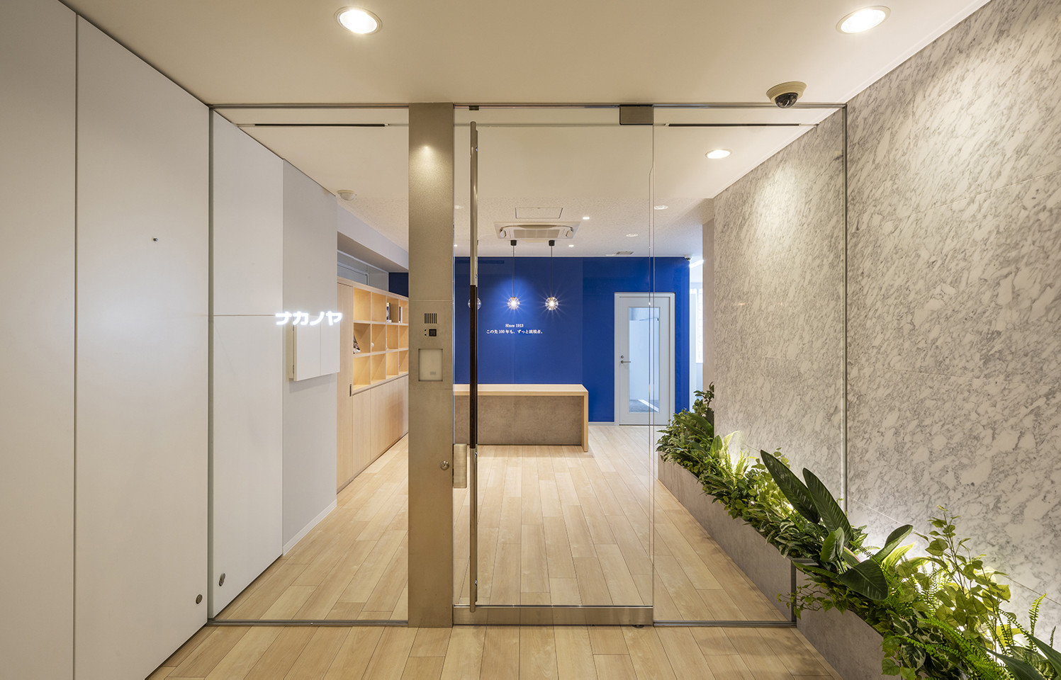 訪れる人々が自然にコミュニケーションを生むよう、リビング空間のように落ち着ける雰囲気を作り出し、ナチュラルテイストのデザインに仕上げました。エントランスは植栽と明るい木目を活かし、温かみのある空間に。また、コーポレートカラーを意識してブルーをアクセントカラーとして使用し、ブランドのアイデンティティを表現しています。さらに、テナントの既存意匠を巧みに活かしつつ、モダンで洗練されたデザインを実現しました。