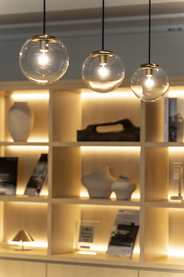 球体の照明器具と飾り棚が、落ち着いたリビング空間の雰囲気を作っています。