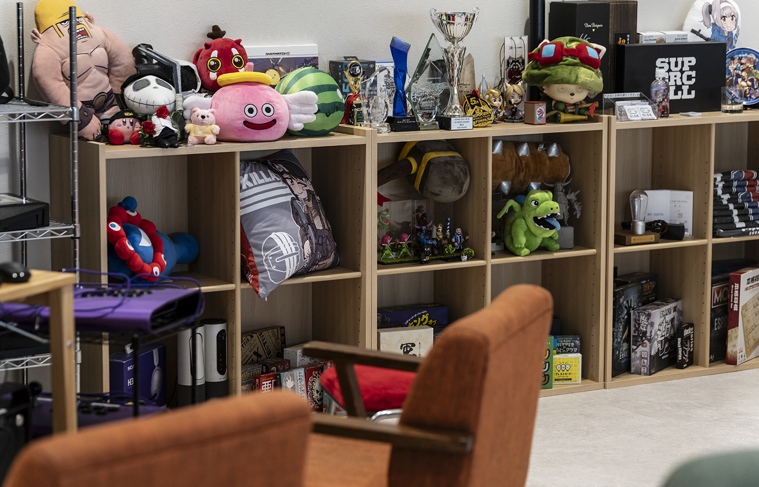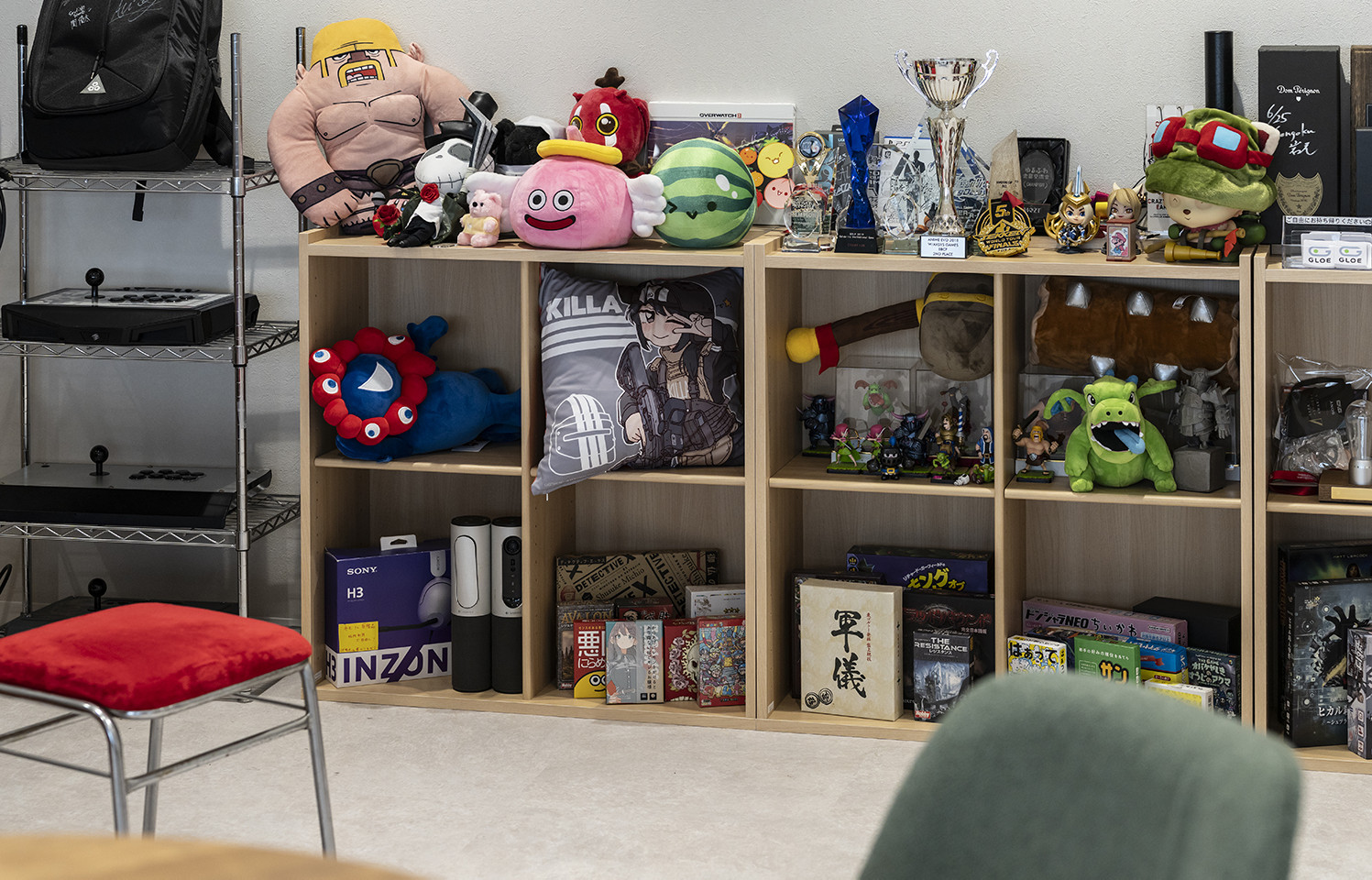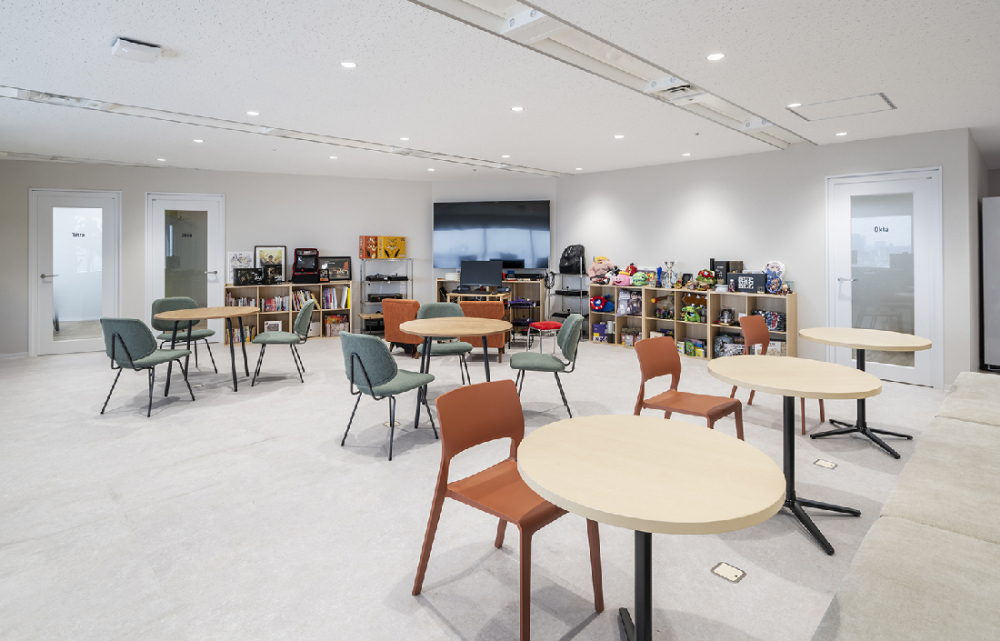 遊び心を取り入れつつシンプルさを大切にしたオフィス空間です。エントランスはコーポレートカラーを基調にブラックで引き締め、エンターテインメントの世界観を演出しました。親会社製作のゲーム機をモチーフにした受付台が来訪者の目を引きます。社内はカフェのように気軽に集まれるテーブル配置とし、素材感のあるマテリアルをアクセントに用いて、自然なコミュニケーションが生まれる場づくりを心がけています。