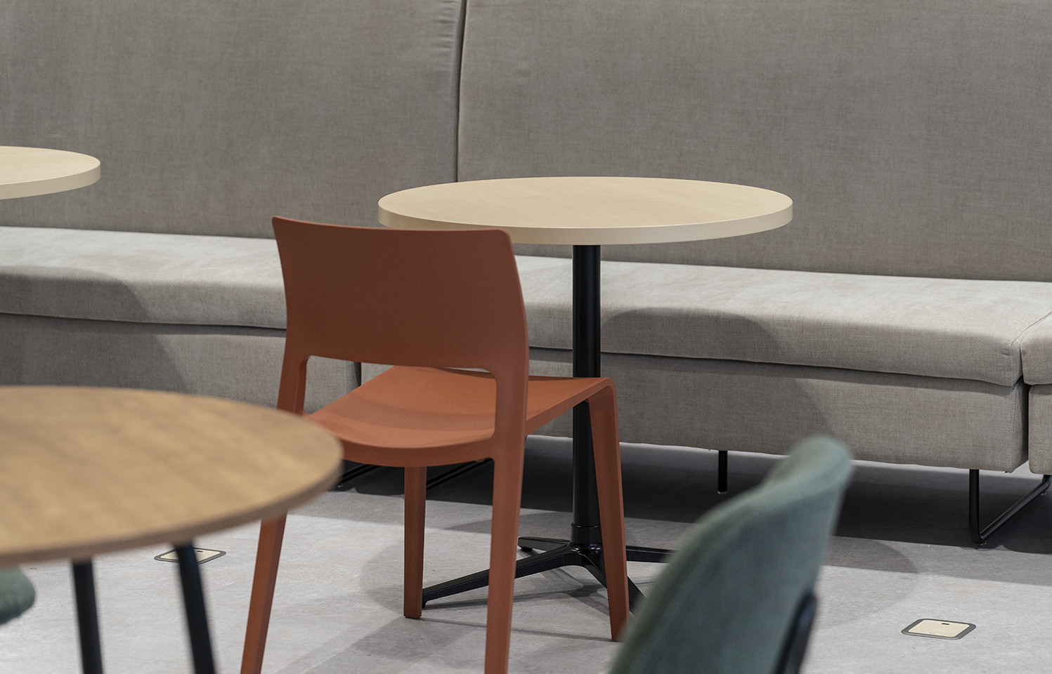柔らかな色合いの家具が、落ち着きの中に遊び心を忍ばせ、コミュニケーションが生まれる雰囲気を演出します。