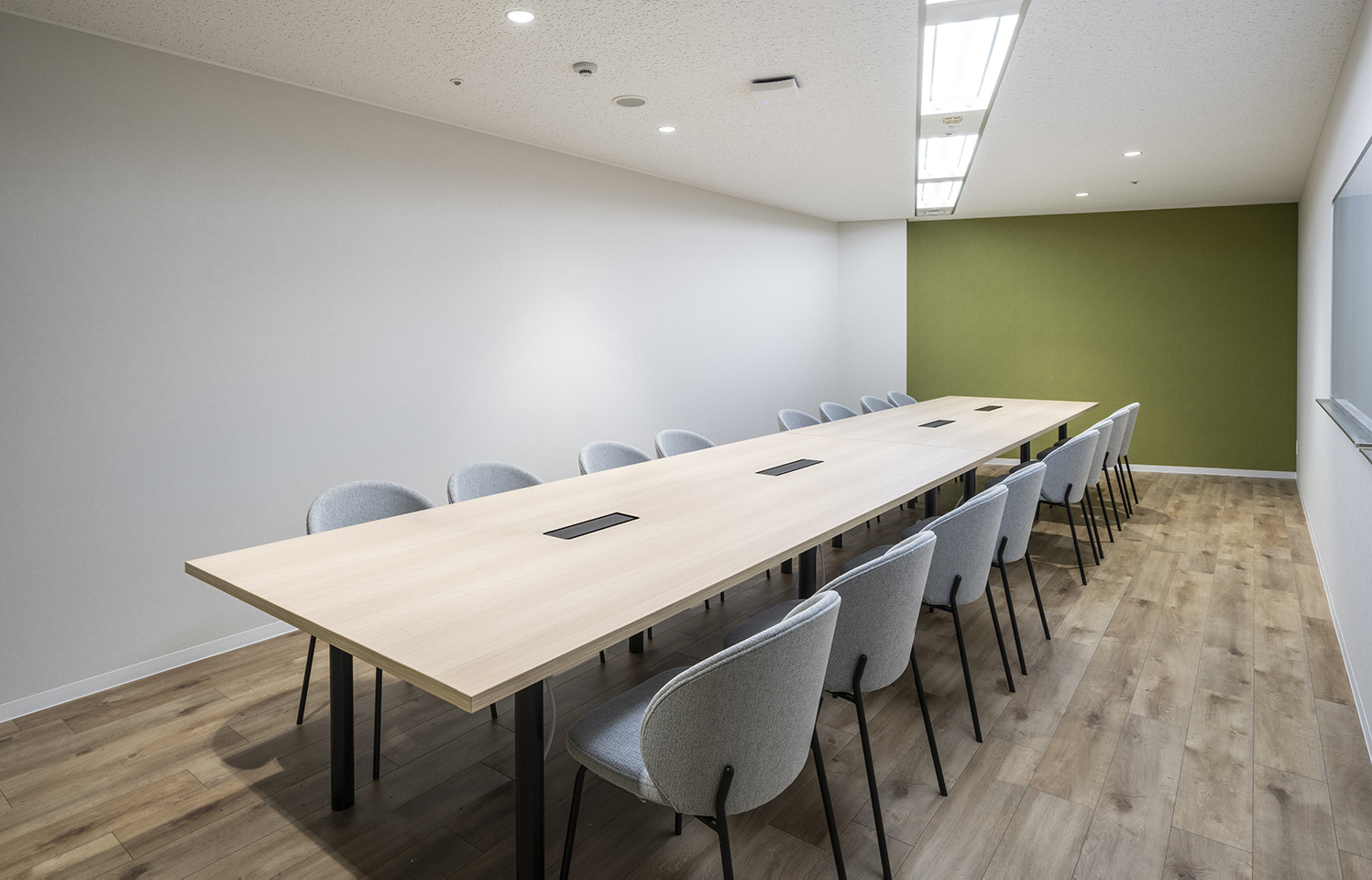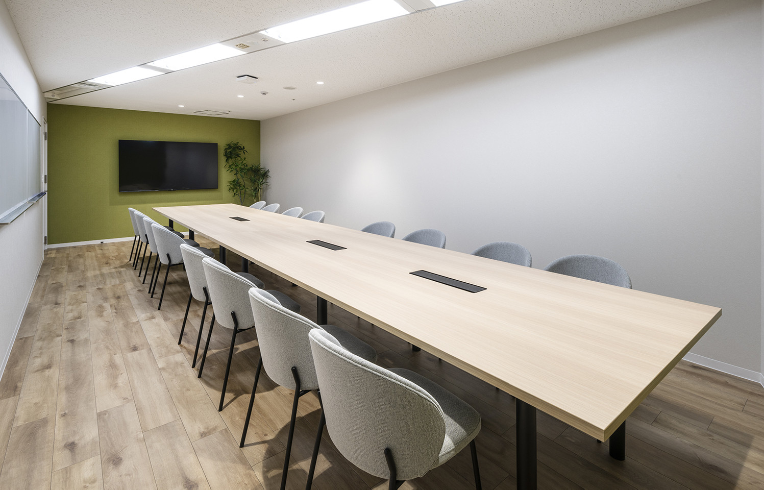 会議室はシンプルなデザインを基調としつつ、コーポレートカラーを壁面に取り入れることで、ブランドイメージを担保しています。