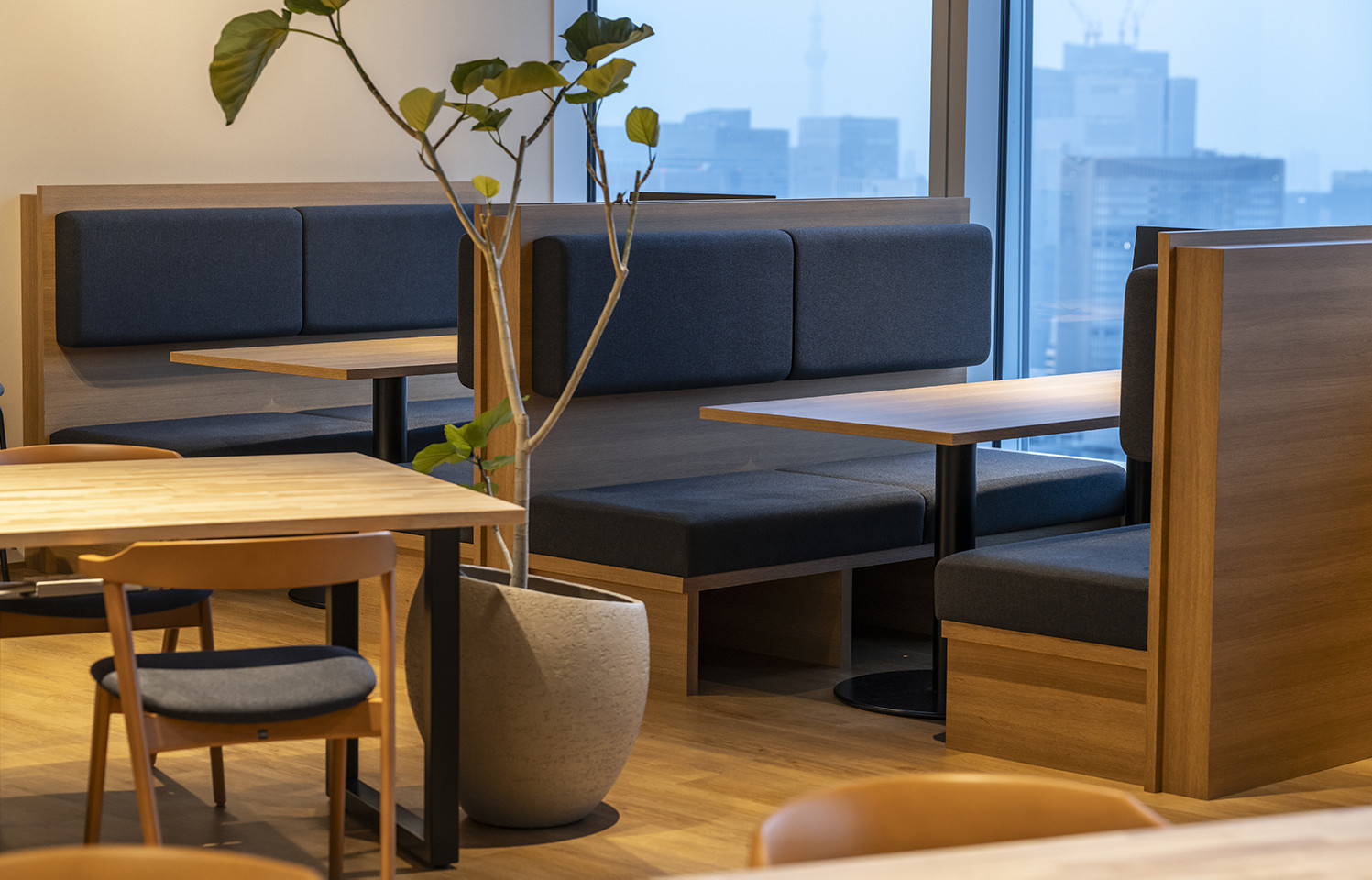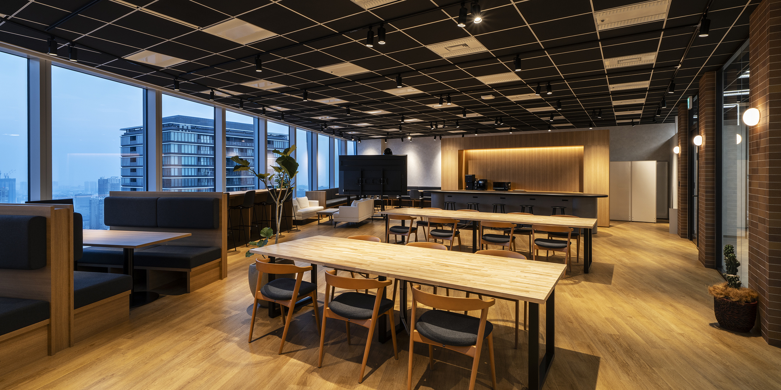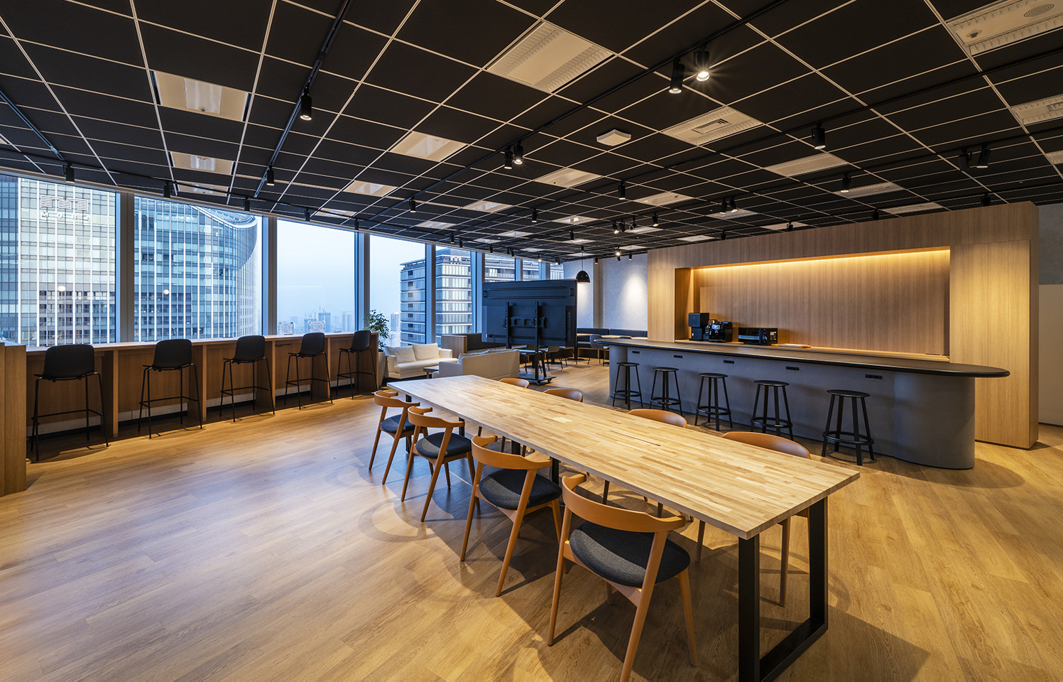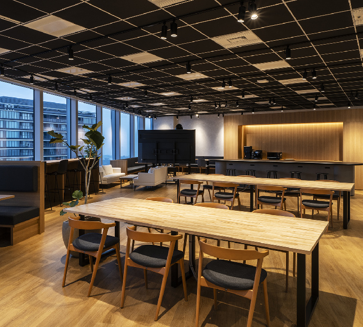 オフィスのデザインは、訪れた瞬間に感じる上質さと品格を大切にしました。まるで邸宅に訪れたかのような、温かみのある空間を演出しています。木目を生かした素材感を取り入れ、アースカラーを基調に落ち着いた配色で統一しました。グリッド状の天井デザインはモダンなイメージで、空間全体に洗練された印象を与えています。また、カウンター席やボックス席などを配置し、自由なワークスタイルに対応。社員や訪問者に心地よい空間を提供し、ブランディング効果を高めます。