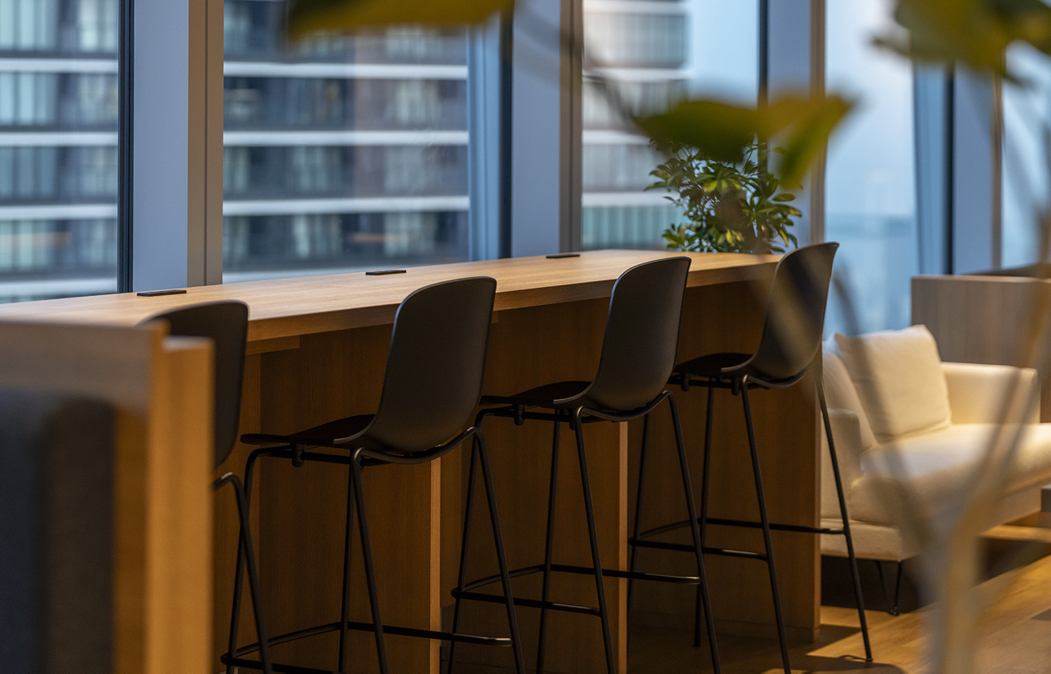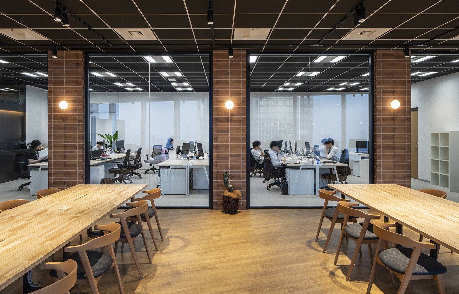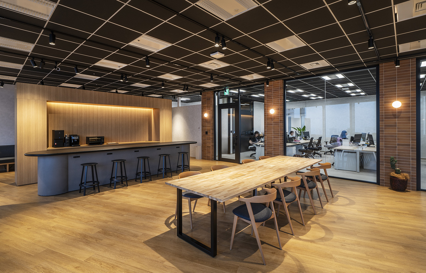 オフィスのデザインは、訪れた瞬間に感じる上質さと品格を大切にしました。まるで邸宅に訪れたかのような、温かみのある空間を演出しています。木目を生かした素材感を取り入れ、アースカラーを基調に落ち着いた配色で統一しました。グリッド状の天井デザインはモダンなイメージで、空間全体に洗練された印象を与えています。また、カウンター席やボックス席などを配置し、自由なワークスタイルに対応。社員や訪問者に心地よい空間を提供し、ブランディング効果を高めます。
