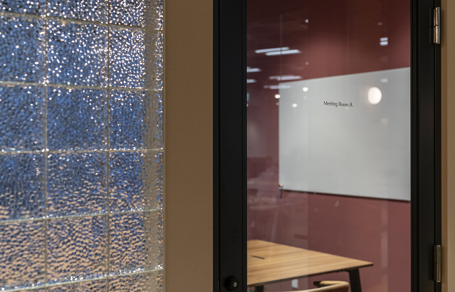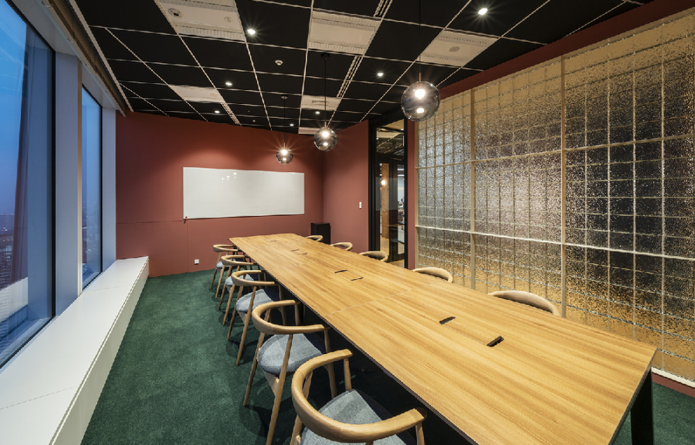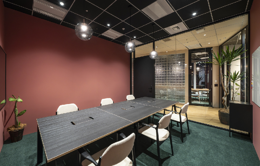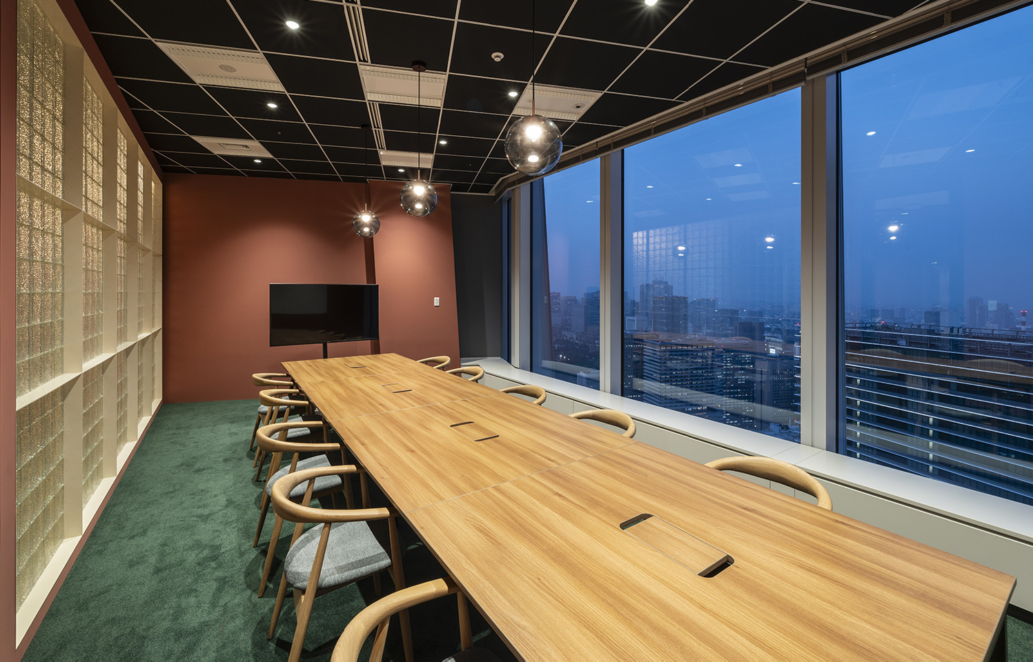 窓に面した大会議室。ガラスタイルの壁とペンダント照明が、特別感を演出しています。