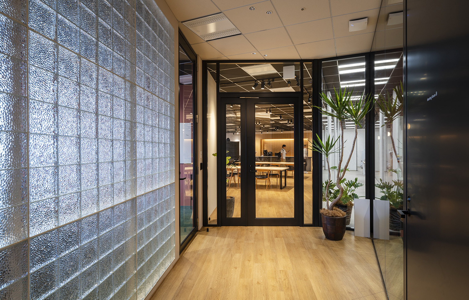 エントランスからオフィス内部へのアプローチ。木目とガラスを組み合わせた開放感のある廊下になっています。