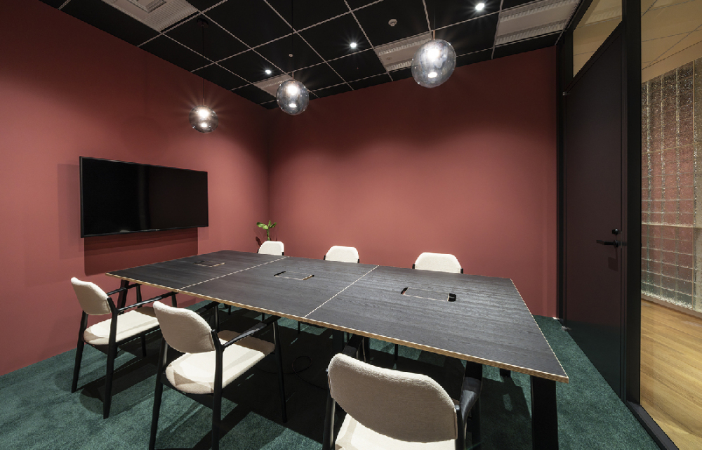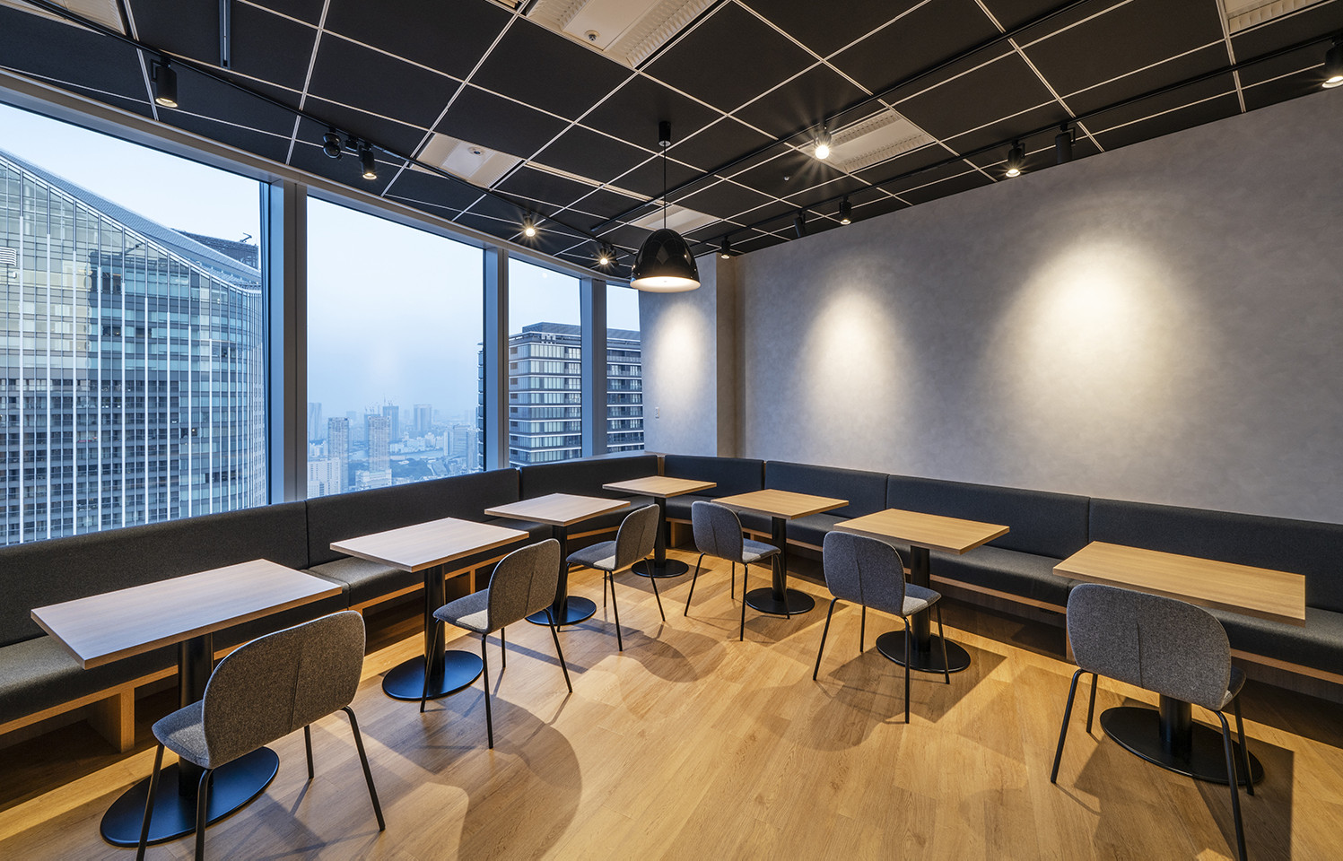 落ち着いたアースカラーとグリッド天井がモダンデザインを演出。大会議室と合わせた配色になっています。