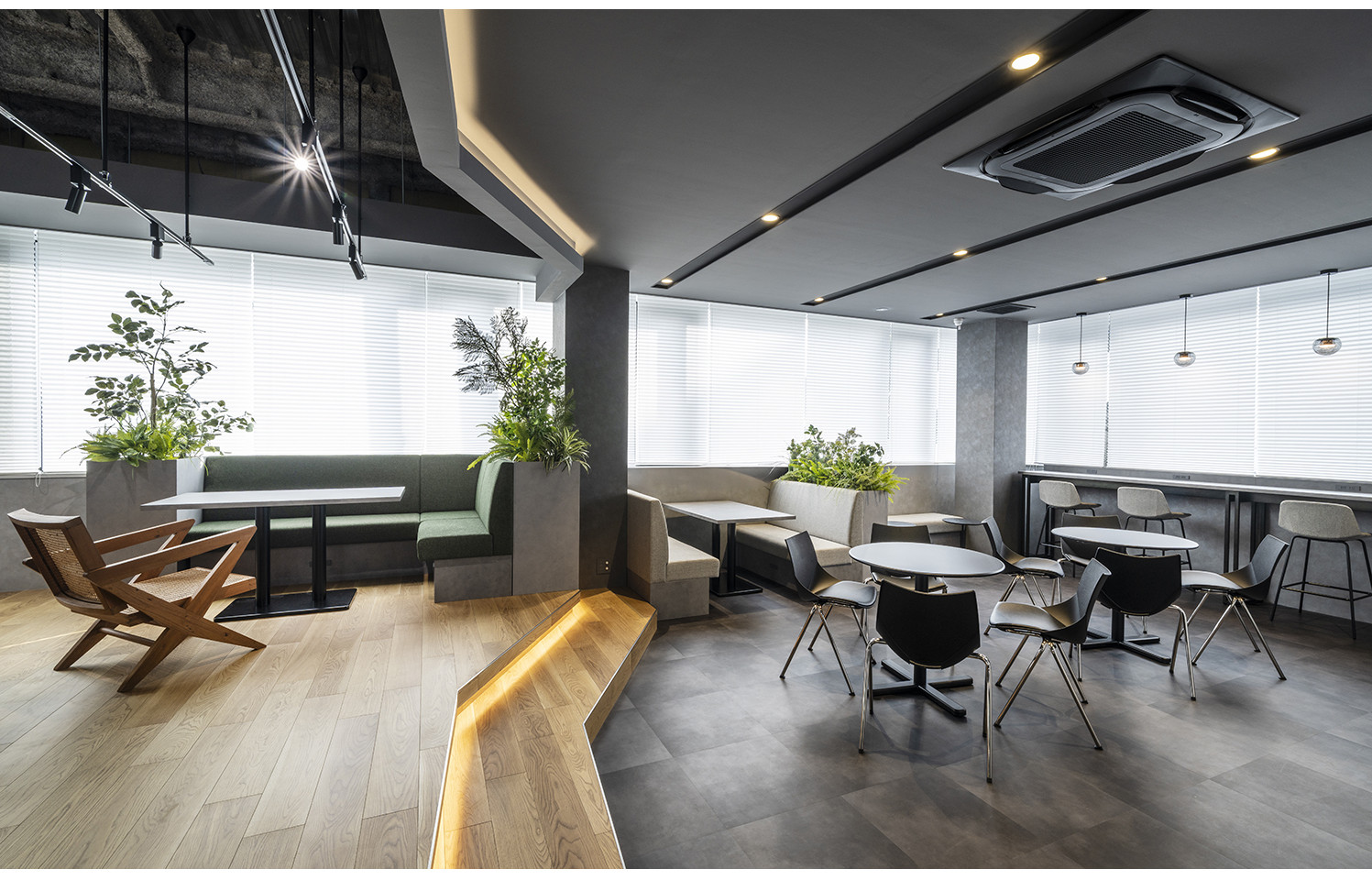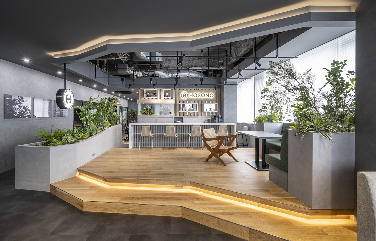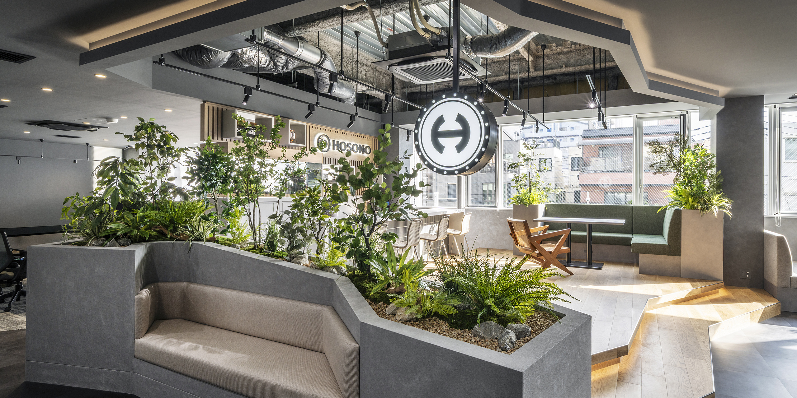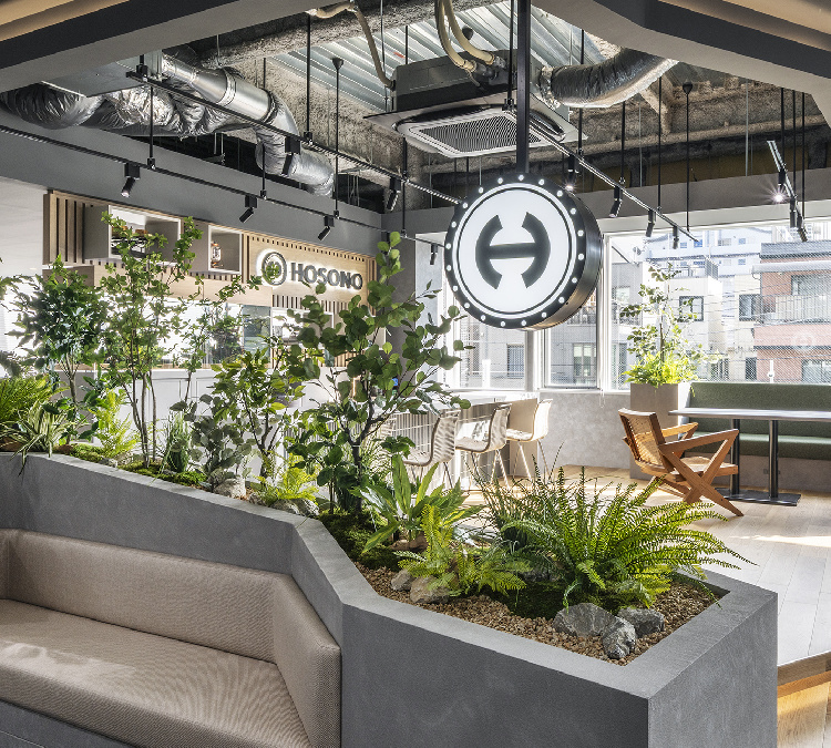 また、グレーを基調に、インダストリアルなテイストと植栽の柔らかさを融合し、温かみと創造性が共存する空間を描いています。