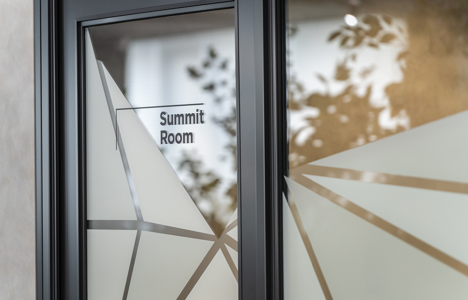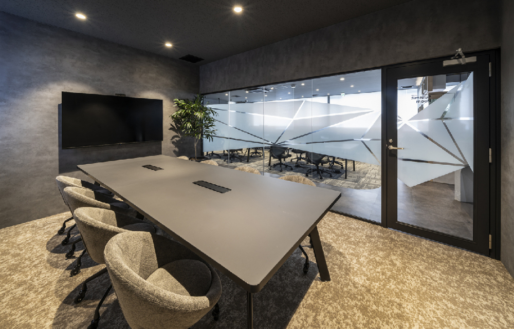 ガラス面に施された矩形グラフィックは、フリーエリアのデザインと呼応する美しいアクセントです。プライバシーを確保する目隠し機能も兼ね備え、空間の質を高めます。