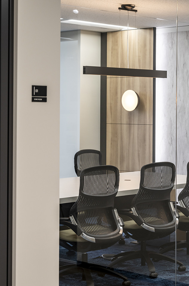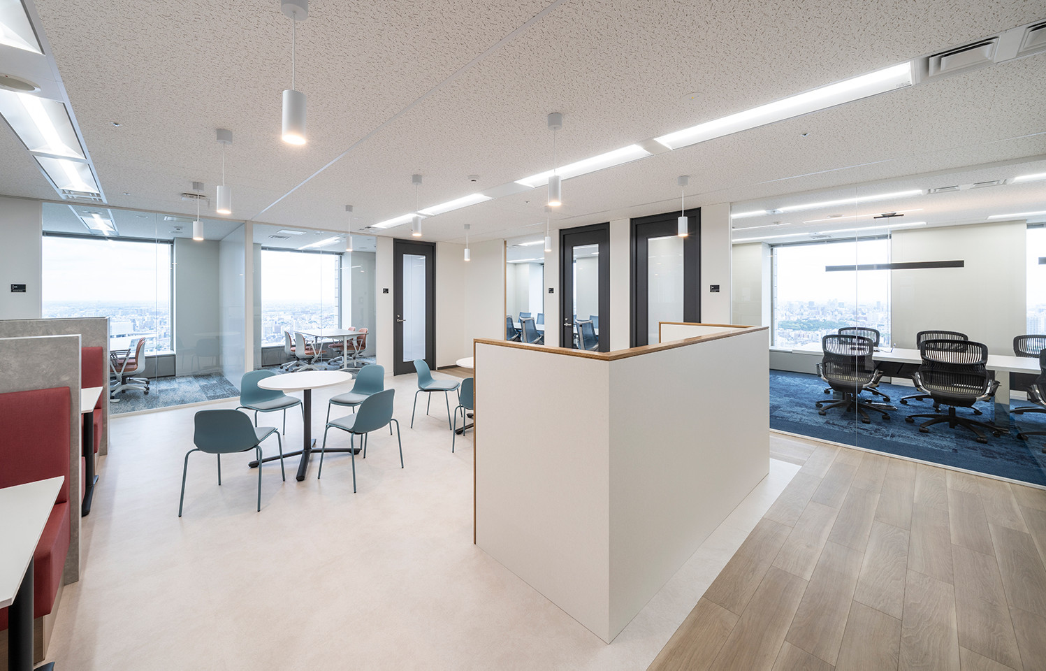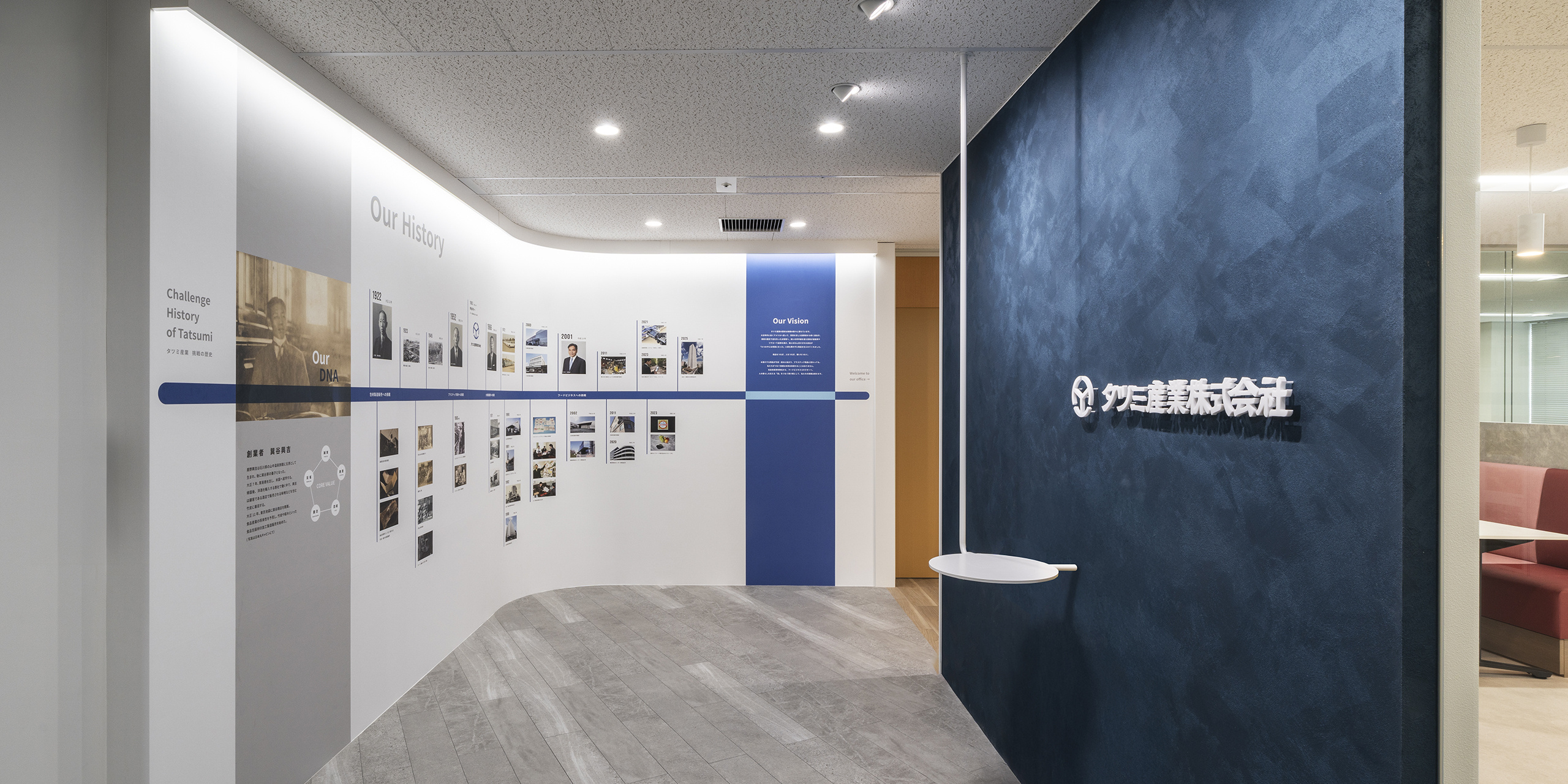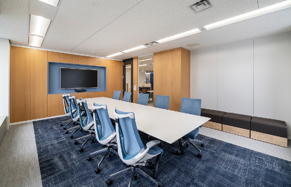 空間全体はコーポレートカラーである青を基調に、北欧カラーを取り入れた柔らかく清潔感のある配色で構成しました。エントランス空間には、企業の歩みを辿る歴史年表をグラフィカルに表現し、過去から未来への歩みを象徴的に表現しています。オフィス家具や壁面などには直線的なデザインを多用し、コンセプトである「コネクト」を視覚的に体現。テーブル席やボックス席、個室会議室など、多様なワークスタイルに対応するミーティングスペースも充実させました。