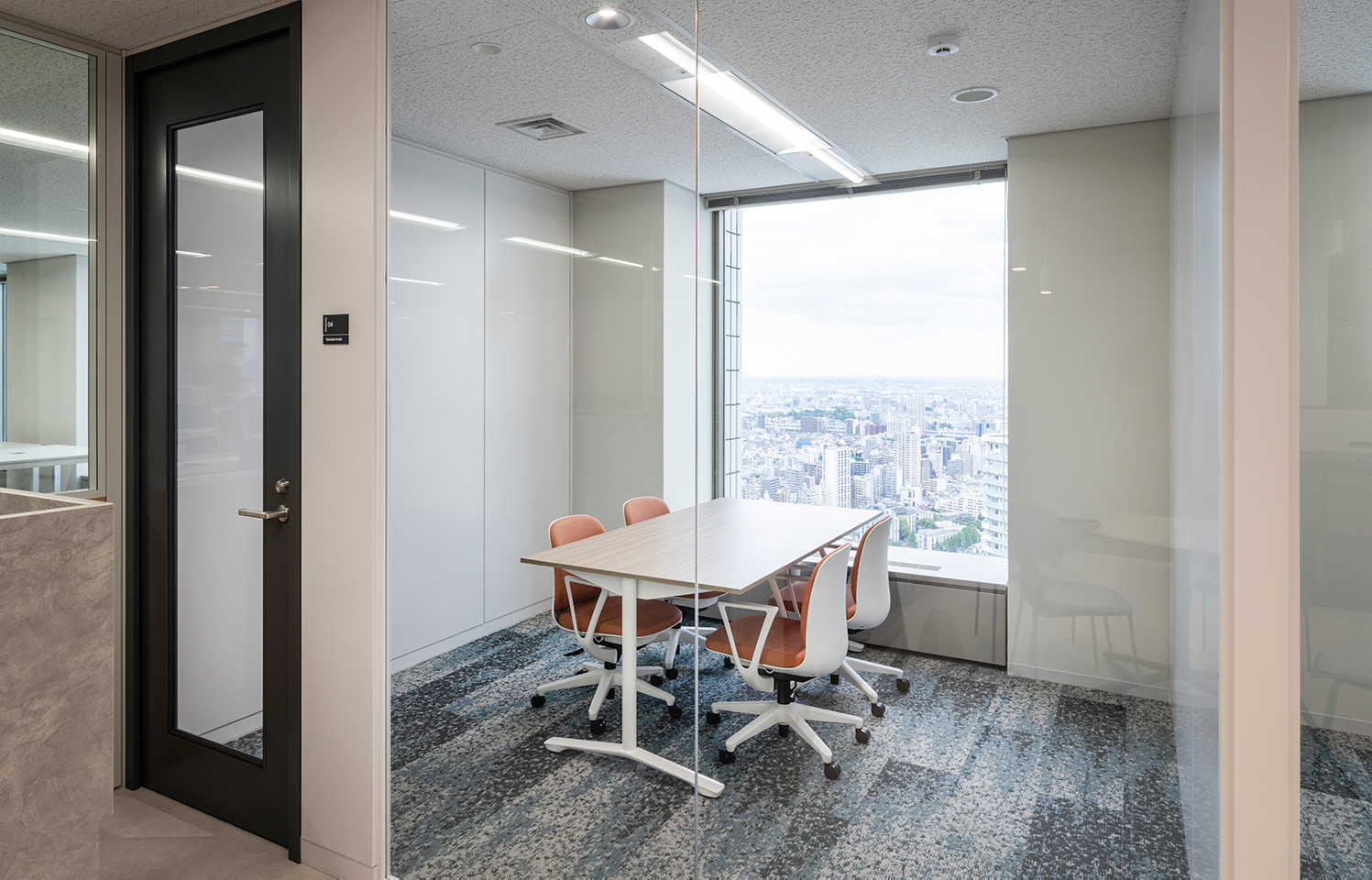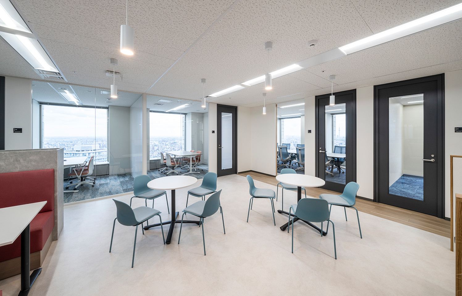 窓側に個室タイプの会議室を配置し、ガラス壁にすることでオフィス全体が明るくなります。
