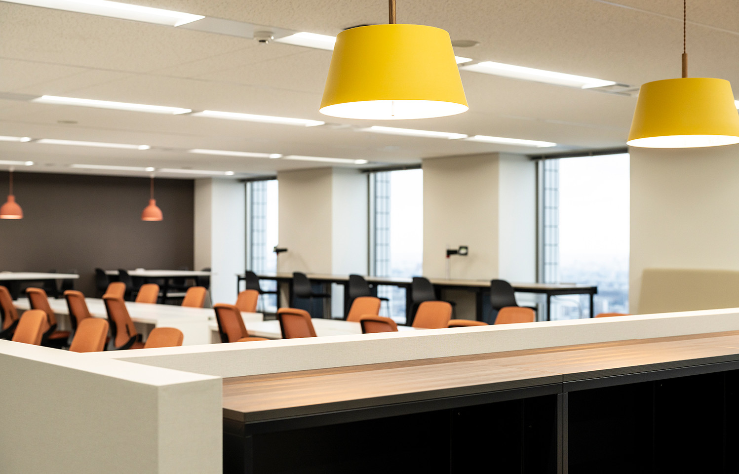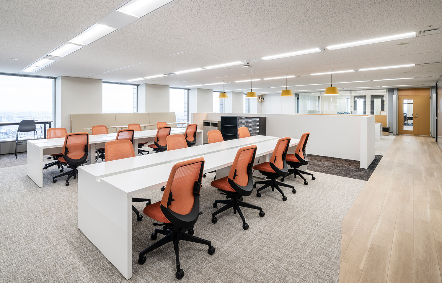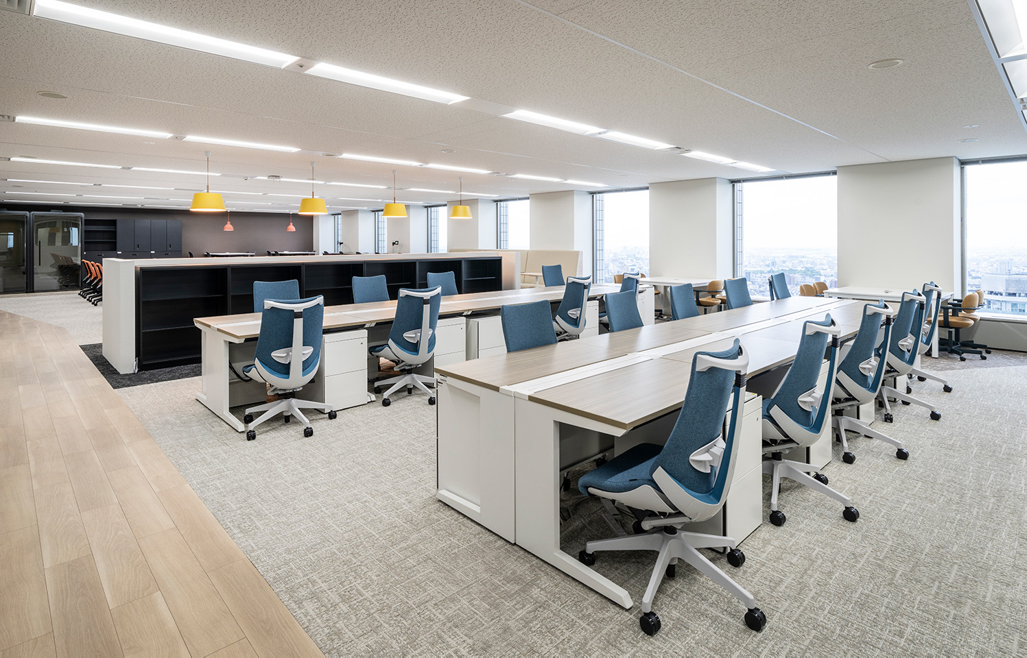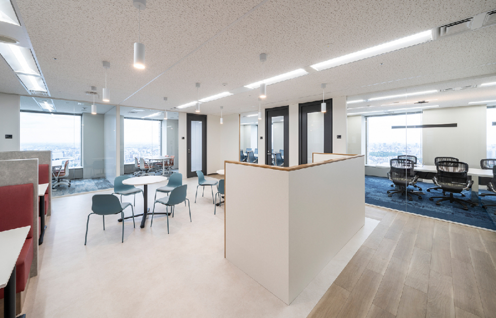 カジュアルなペンダントライトが、オフィス空間を柔らかく演出。自然とコミュニケーションにつながります。