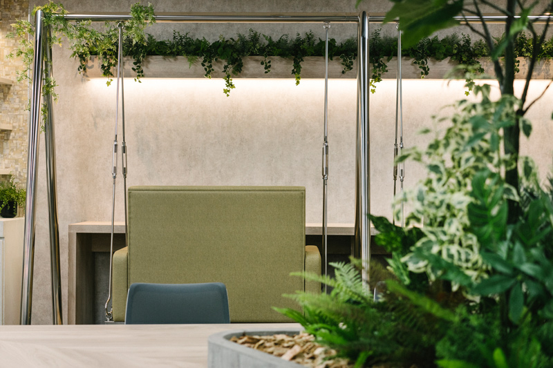ブランコや三角形の執務デスクなど、ちょっとした遊び心を取り入れました。