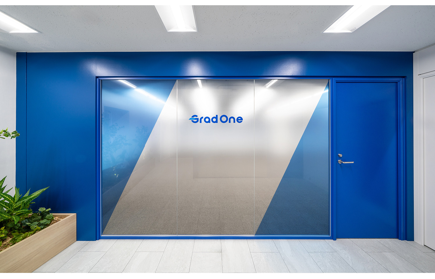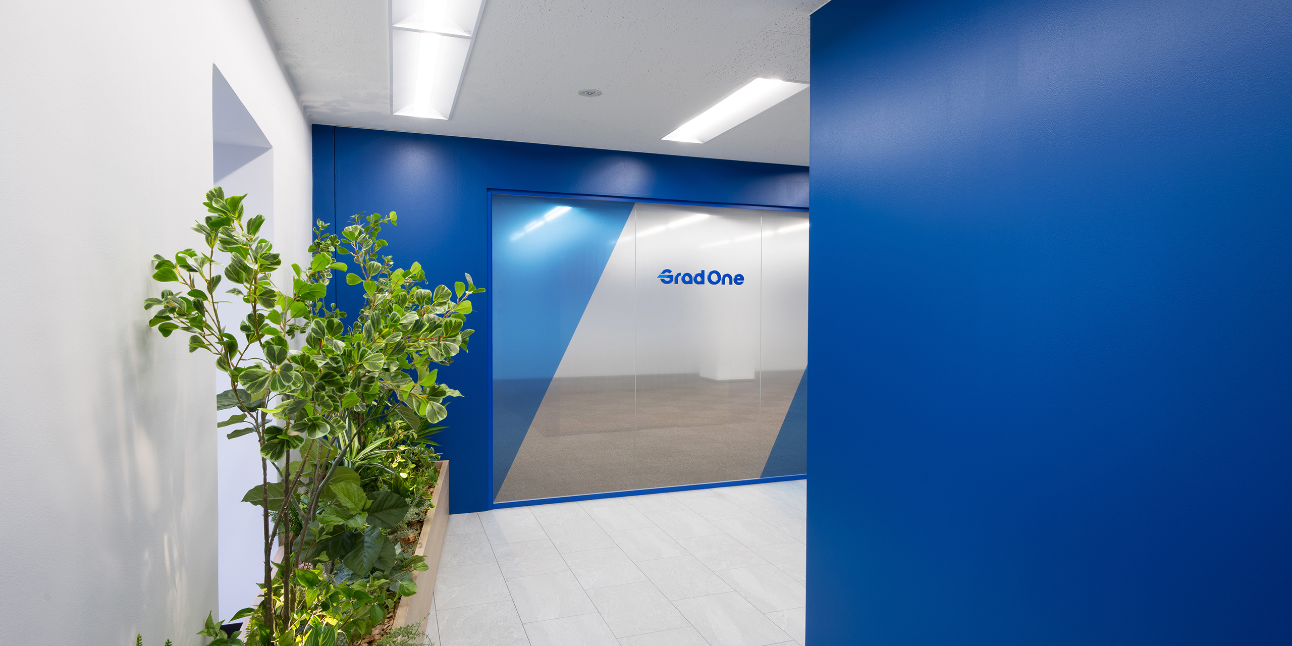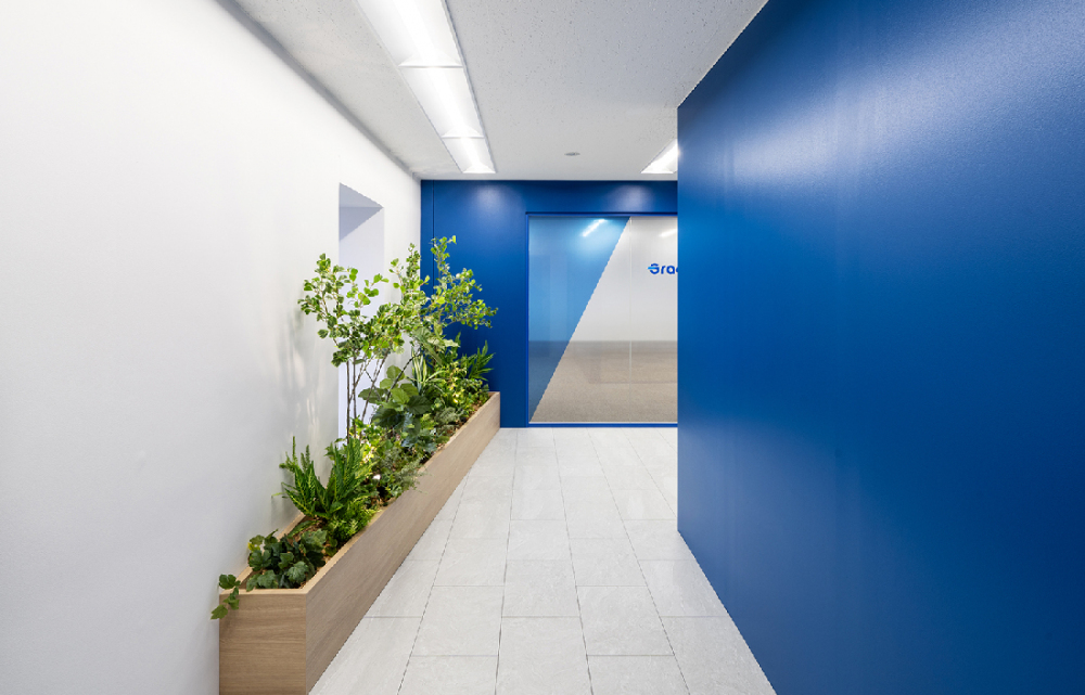 コーポレートカラーを大胆に取り入れたファサードによって、企業らしさを印象的に発信するデザインとしました。植栽のナチュラルな質感やガラスの透明感を組み合わせ、軽やかさと信頼性を両立させることで、さらなるイメージアップを図っています。さらに、斜めに分割したグラフィックは、挑戦を重ねながら前進する企業の成長を象徴する要素として配置。ブランドが“動き出す”オフィスを目指し、視覚効果と体験価値を戦略的に高めています。
