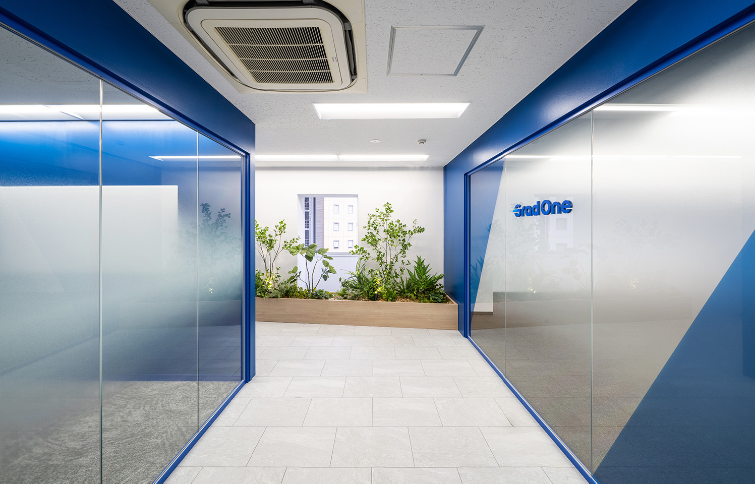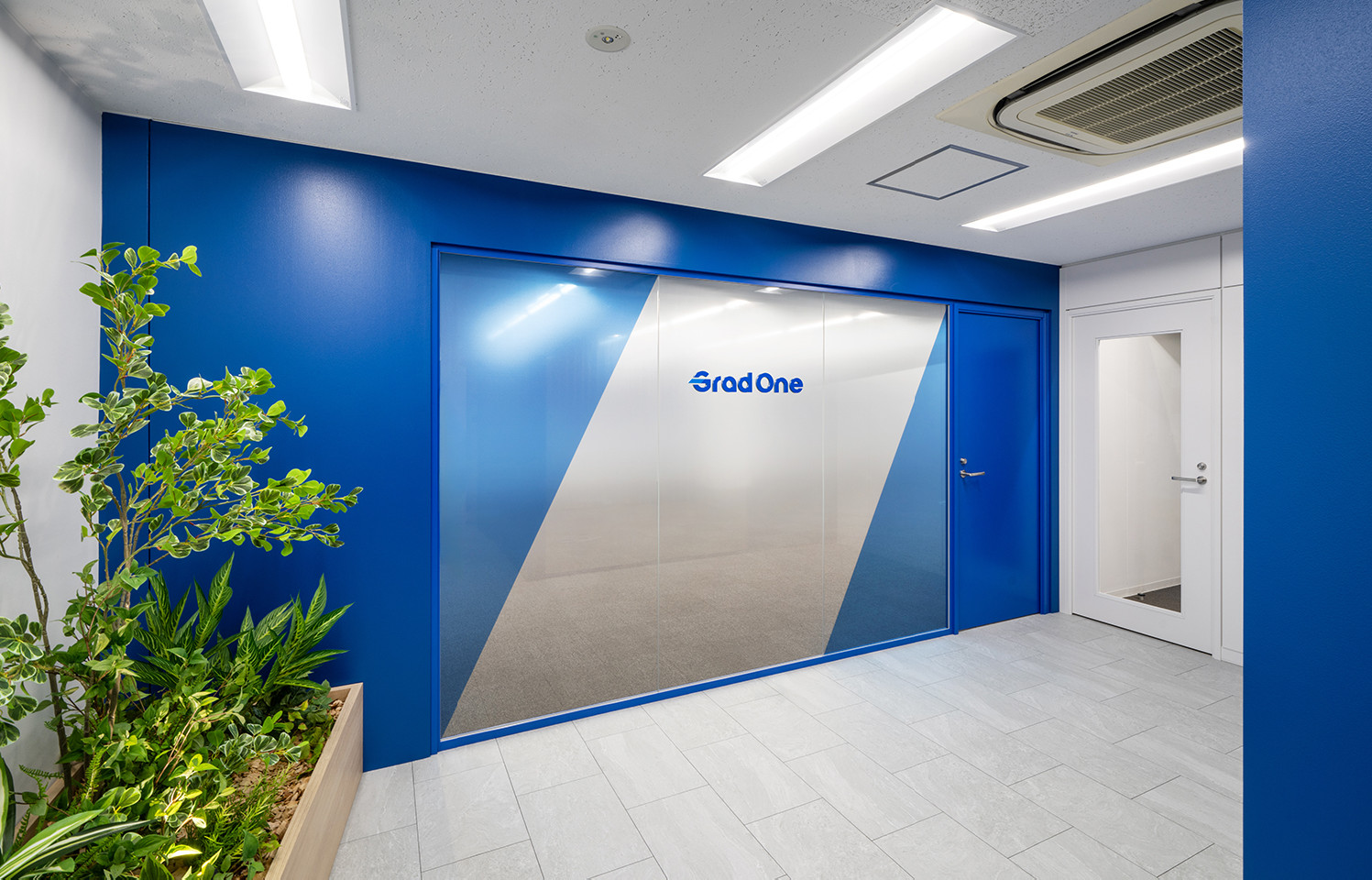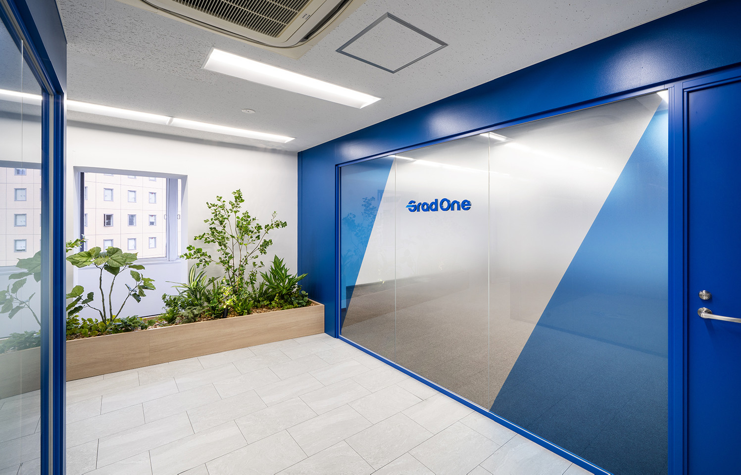 コーポレートカラーを大胆に取り入れたファサードによって、企業らしさを印象的に発信するデザインとしました。植栽のナチュラルな質感やガラスの透明感を組み合わせ、軽やかさと信頼性を両立させることで、さらなるイメージアップを図っています。さらに、斜めに分割したグラフィックは、挑戦を重ねながら前進する企業の成長を象徴する要素として配置。ブランドが“動き出す”オフィスを目指し、視覚効果と体験価値を戦略的に高めています。