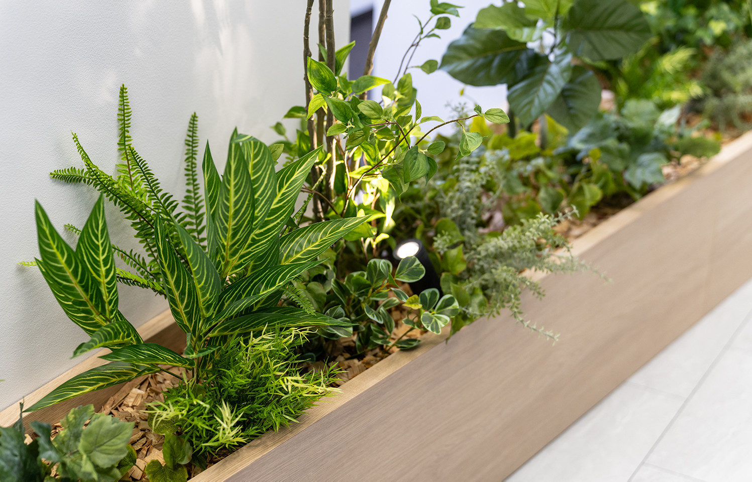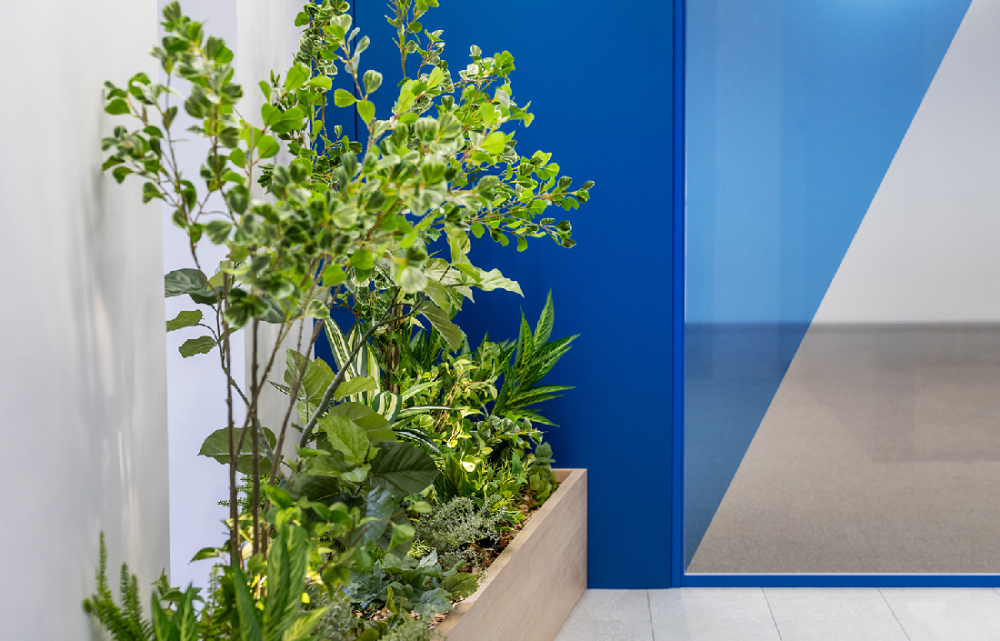 ボリュームのある植栽と、木質のプランターが温かみを演出。企業の信頼性をさりげなく演出しています。