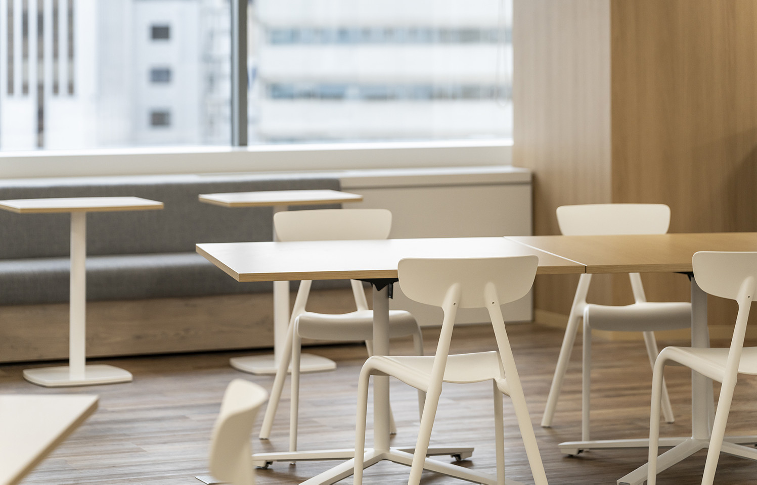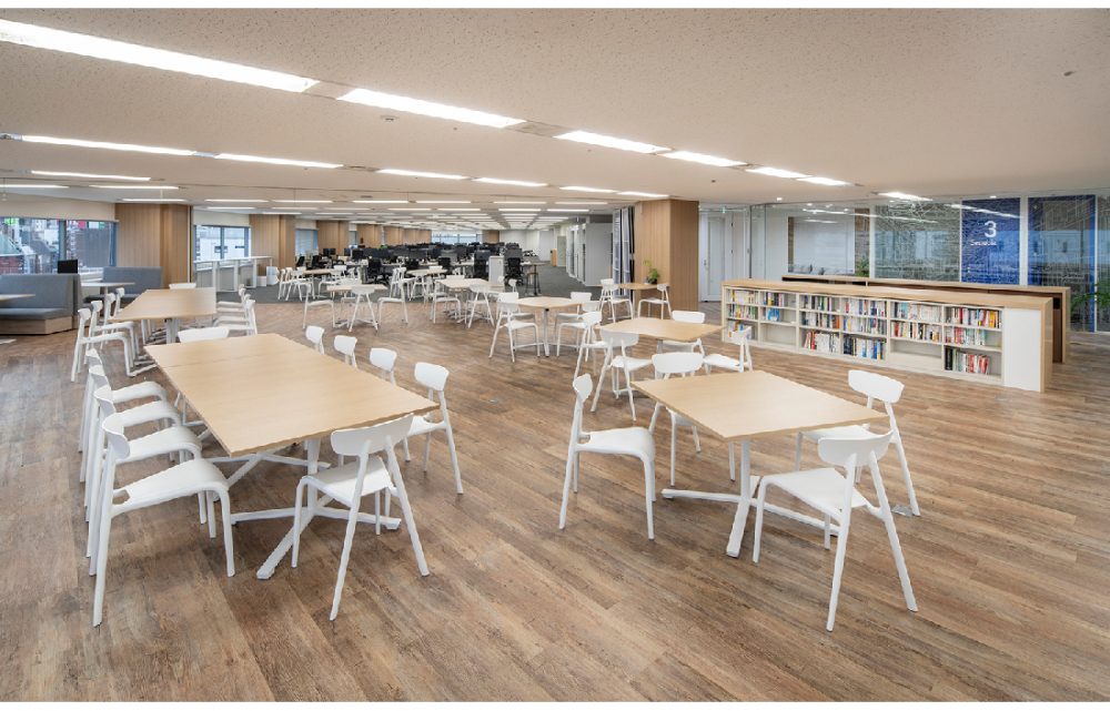中央にはカフェスペースを設け、カウンター席やボックス席など多様な座席が、自然なコミュニケーションを生むタッチポイントとして機能しています。